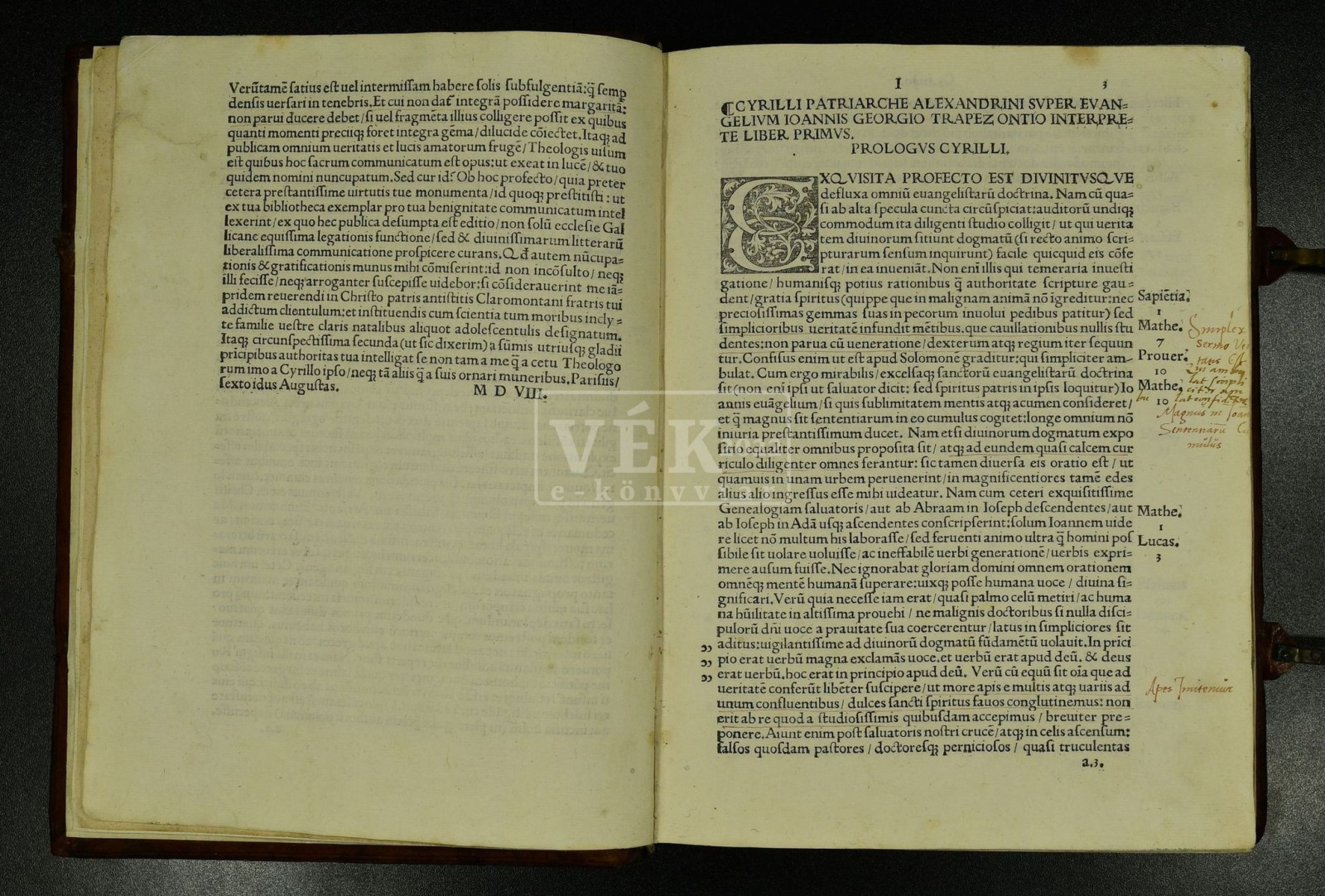 Alexandriai Cirill Szent János evangéliumához írt magyarázata Párizsban jelent meg 1508-ban. A keleti egyházatya 412-ben vette át az alexandriai patriarchátus vezetését. Életművét a nesztorianizmussal szembeni fellépése tette ismerté. Elnökölt az 431-es Efezusi Zsinaton, amely elítélte az eretnek tant.