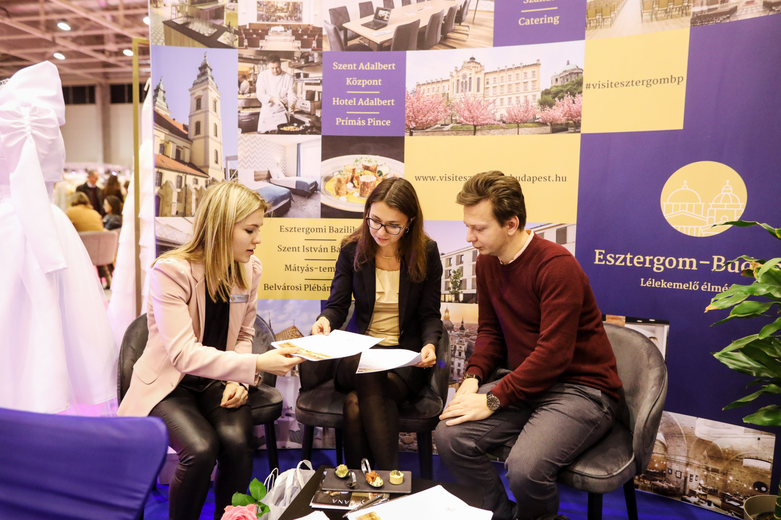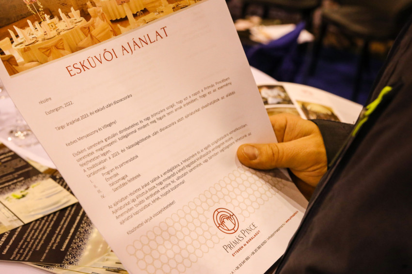 Miért jó jelen lenni az esküvőkiállításon? – miközben Évával és Norbi atyával beszélgetünk, újabb érdeklődő pár érkezik a standhoz. Kaszás Veronika, a Prímás Pince rendezvényszervezője ülteti le őket, Norbi atya pezsgőt kínál nekik.