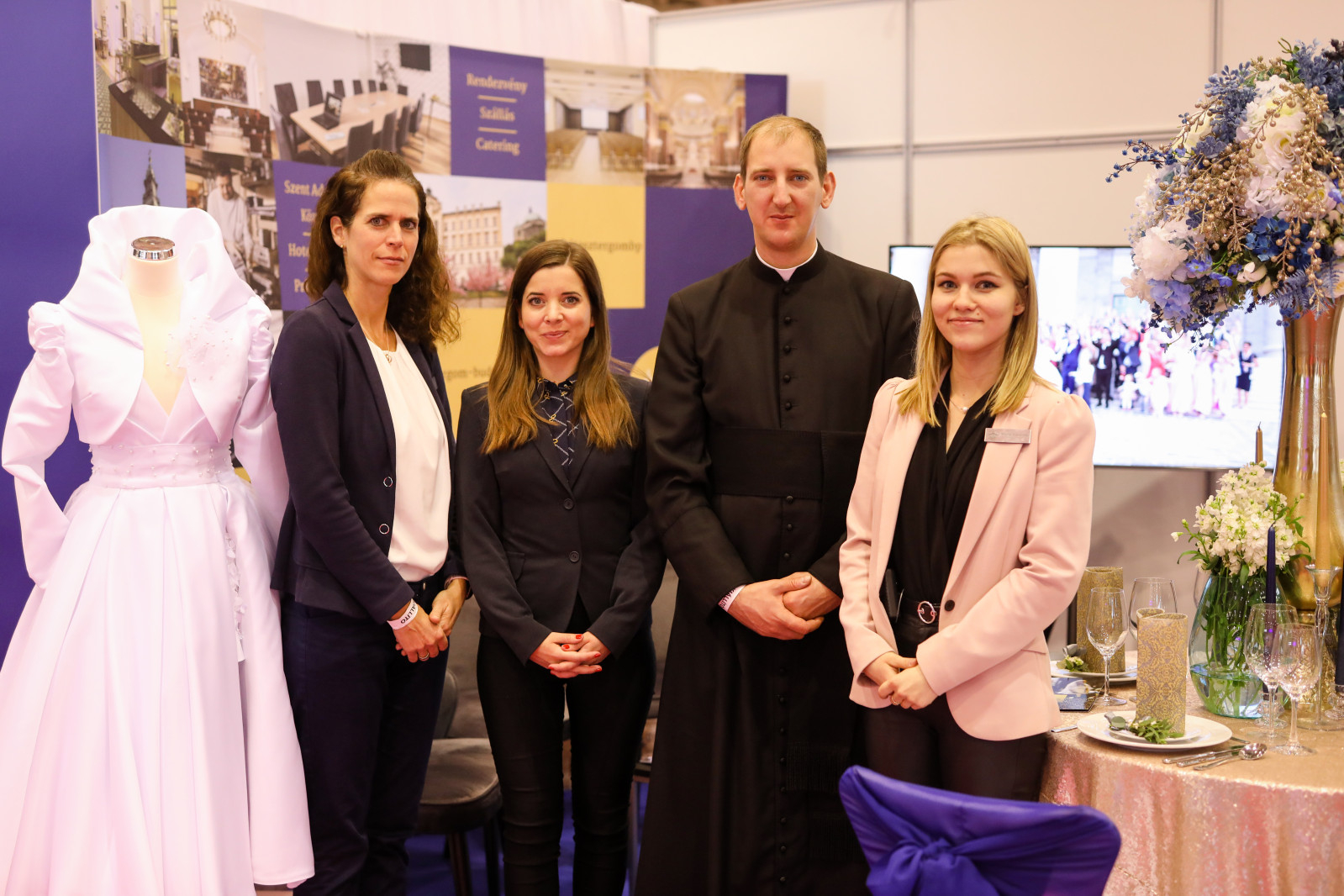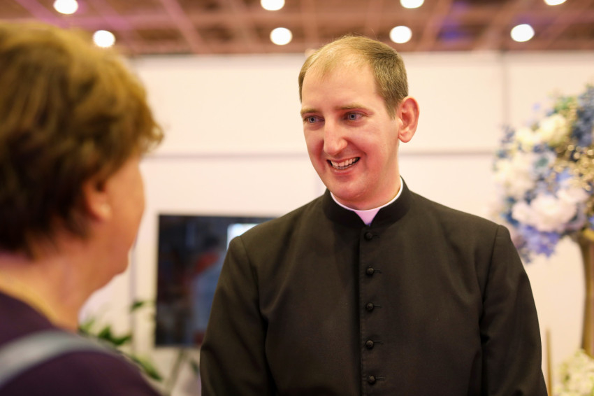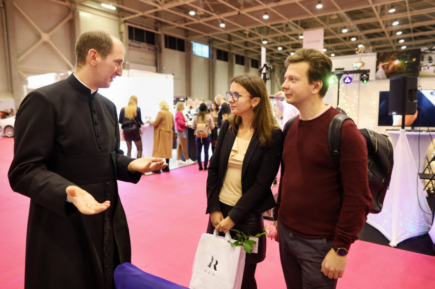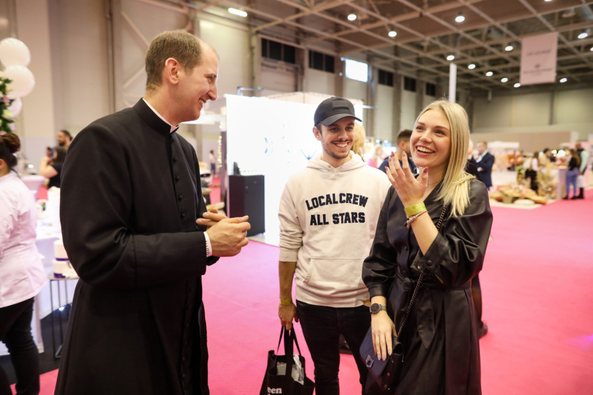 A stand előtt sürög-forog Varga Norbert atya. Fekete reverendában feltűnő jelenség, amit ki is használ. A sétáló párokat sorra megállítja mosolya, és akik szeméből érdeklődést olvas ki, azokat a standhoz invitálja. „Egyrészt fontos, hogy ennyire figyelemfelkeltő és hívogató a dekoráció. Másrészt a reverendám is. A párok arcán sokszor érzékelem az elcsodálkozást.