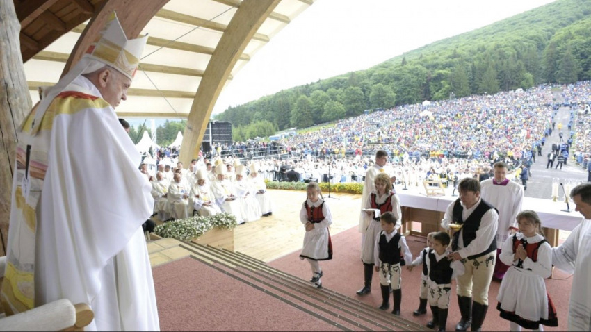 Már közeledtünk a csúcshoz, amikor megjelent egy fegyveres katona, hogy tovább nem mehetünk, vissza kell fordulni. Olyan sárosak és vizesek voltunk, hogy már az is mindegy volt, fogjuk-e az esernyőt vagy sem. Próbáltam megértetni vele: nem fordulhatunk vissza, mert nem érünk oda időben, nehéz is lett volna a csúszós, meredek hegyoldalon leereszkedni. Tanakodtunk, mi legyen, kicsit már csalódott is voltam, hogy ezeken a szigorú biztonsági szabályokon fog múlni a Szentatyával való találkozás. Egy katona felvállalta, hogy az erdő között, derékig érő fűben elvezessen a Salvator-kápolna melletti útra, majd átadott egy következő katonának, aki a beléptető kapuhoz irányított. Tudtam, hogy egy ilyen nagy kegyelem velejárója a megpróbáltatás is, de nem fizikaira számítottam” – meséli a családfő.