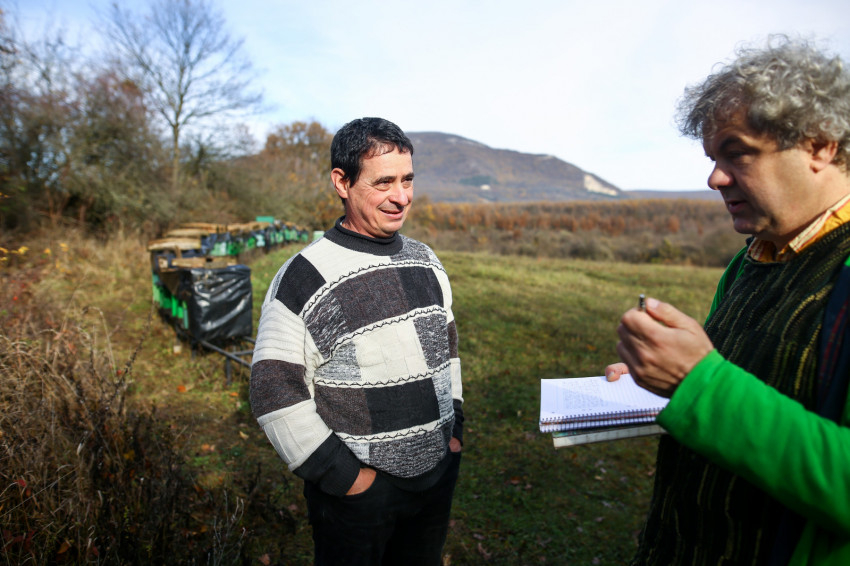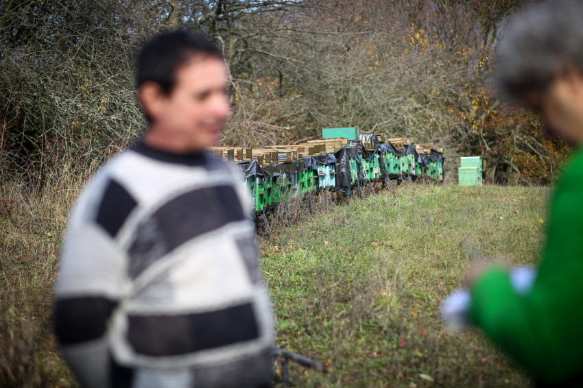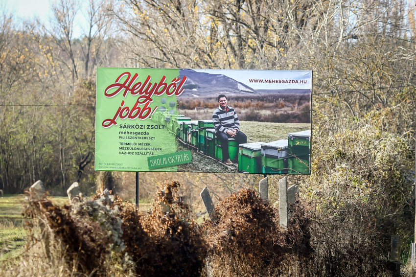 Pilisvörösvár, Pilisszántó és Piliscsaba között járunk, és egy dámvadkert mellett haladunk el, amelyet gyakran látogatnak az orvvadászok. Aztán a semmi közepén egyszer csak vaskapu zárja el az utat, amely a Sárközi-méhészet telepének határát jelzi. Ötven méhcsalád él itt. Ez a család egyik méhese a háromból (a másik kettő Csobánkán és Pomázon van). Amikor Zsolt kinyitja a kaput, majd némi újabb rodeózás után egy tisztásra érünk, és kiszállunk, gyönyörű panoráma tárul elénk végtelennek tűnő réttel és távoli hegyekkel, köztük a Kis- és a Nagy-Kevéllyel, falvakkal. De minden nagyon messzinek tűnik most, ez a hely pedig a világ közepének.