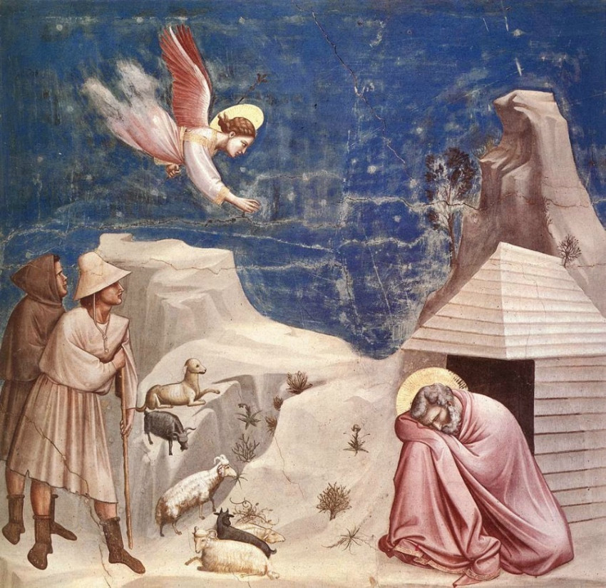 Ugyanekkor az Úr angyala Joachimot is meglátogatta, azzal az üzenettel, hogy „az Úristen meghallgatta a kérésedet. Térj haza innen. Íme, feleséged, Anna, a méhében fogant.” Giotto ezt a jelenetet is megfestette.