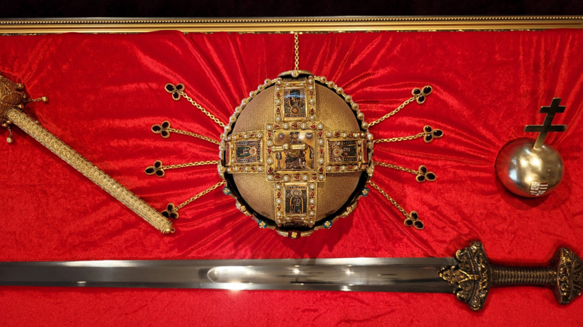 A kiállított korona, jogar és országalma nem az Amerikából visszatért korona másolata, hanem annak a koronának a rekonstrukciója, amellyel Szent Istvánt koronázták meg. Az eredeti és a kiállított korona közötti különbség egy zománckép, amely elveszett az eredetiről. A képen Mária és a két arkangyal látható, a kiállított darabon megtekinthető. A kiállított korona érdekessége, hogy ugyanolyan kézműves munkával és szerszámokkal készült, mint az eredeti; a jogarral és országalmával együtt.