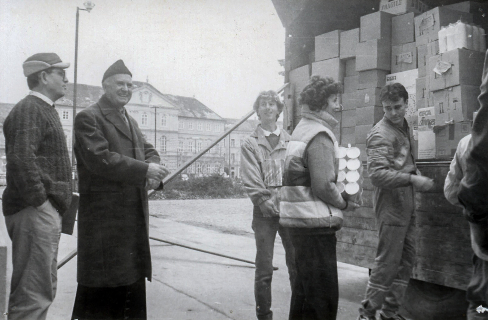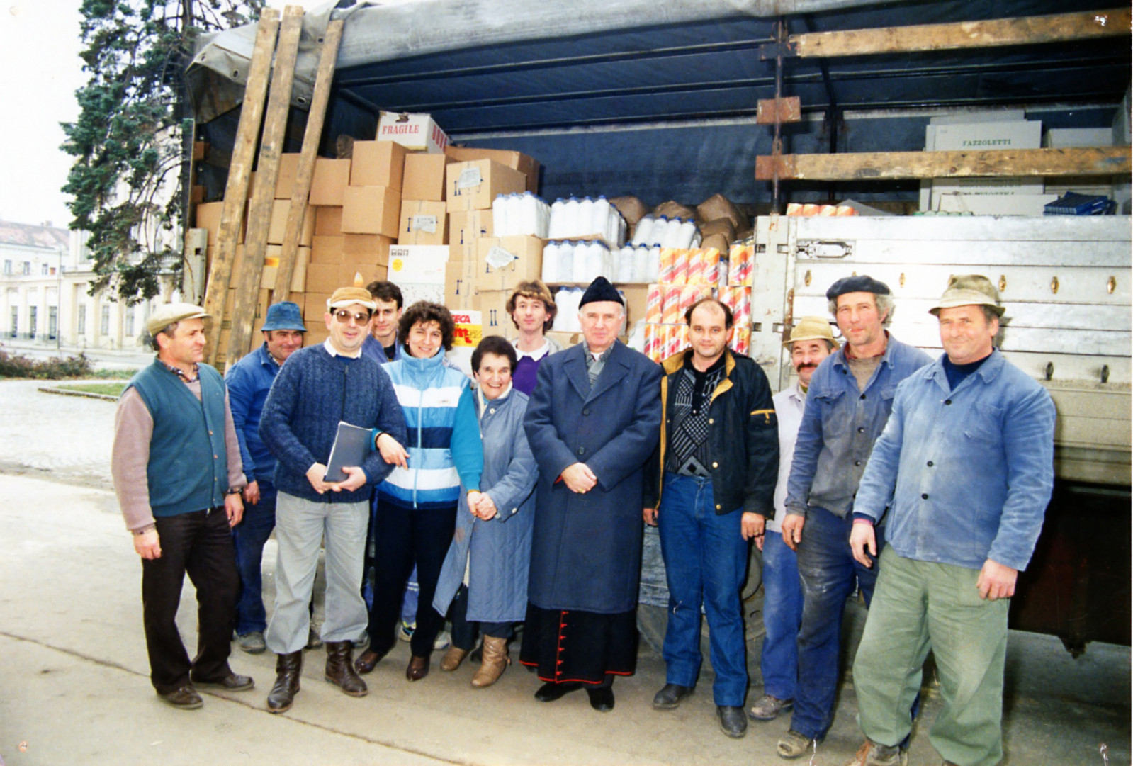 Konkoly István megyéspüspök jóváhagyásával a Szombathelyi Egyházmegye 1,2 millió forint értékben vásárolt élelmiszert, egy kamionnyit. Horváth Sándor néprajzkutató – aki akkor a Vas Népénél dolgozott, valamint a Szombathelyi TV-ben a katolikus műsort vezette – volt a kamion kísérője, mivel horvát anyanyelvűként megértette magát a menekültekkel. Miután hazajött, hosszú cikket írt a megyei napilapba, amiben szó esett a karitászról is. A jószolgálati szervezet ezáltal nyilvánosságot kapott, hallottak róla az atyák. A következő hónapban a püspök megmutatta a cikket, és kérte, hogy minden plébánián legyen karitászcsoport.