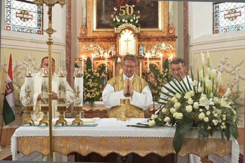 A szentmise végén Szarka Gábor agyagosszergényi plébános köszöntötte Németh Lászlót, aki aranymisés áldásban részesítette a jelenlévőket.