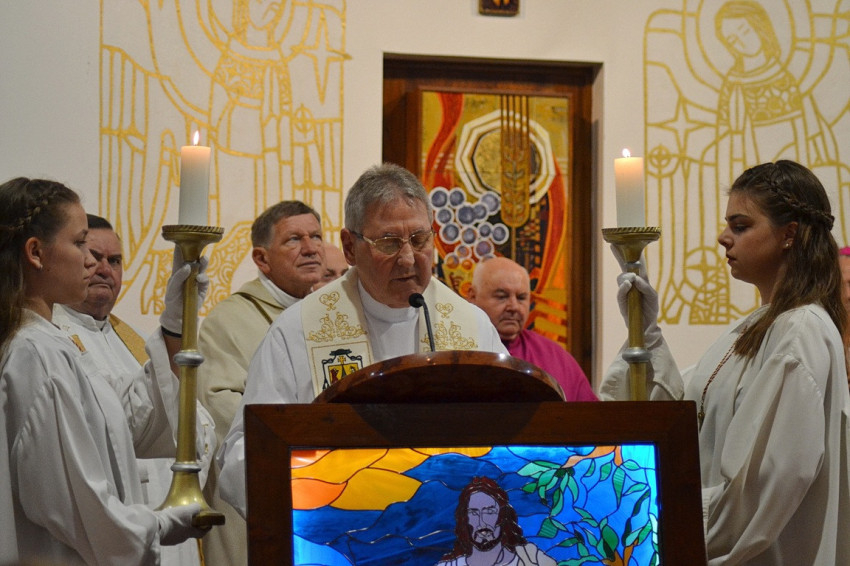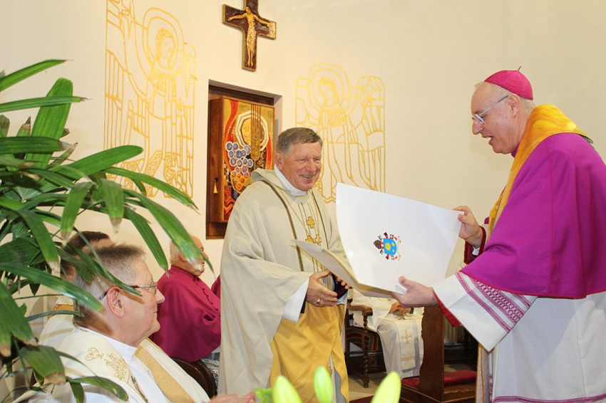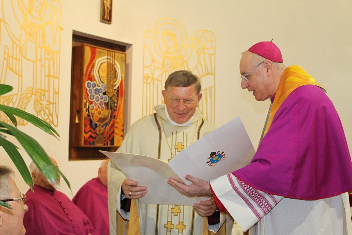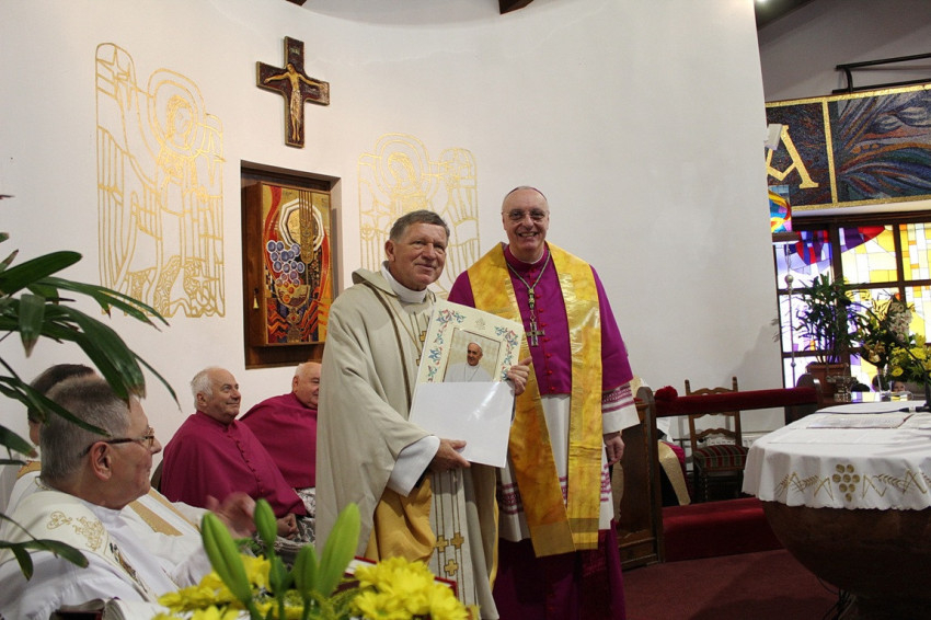 A szentmise végén Veres András győri megyéspüspök átadta a Szentatya apostoli áldását kinyilvánító okiratot az aranymisésnek, végül pedig Ferenc atya köszönte meg szeretteinek, a híveknek, segítőinek, hogy ilyen sokan ünnepeltek vele ezen a különleges napon.