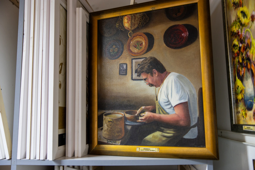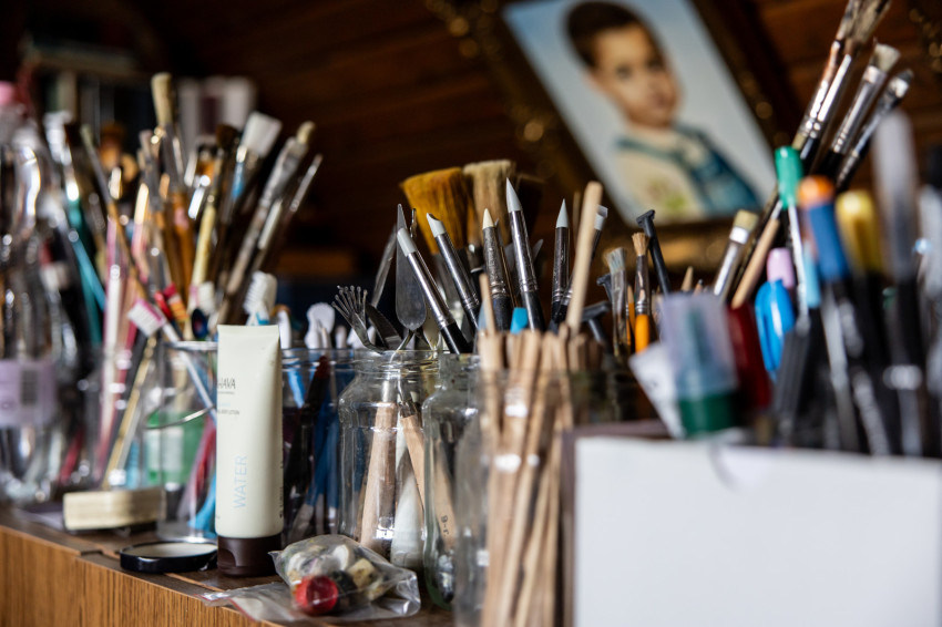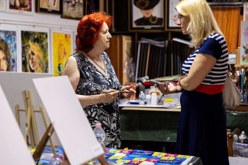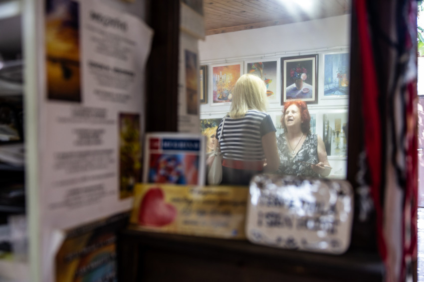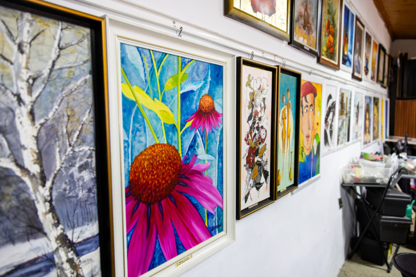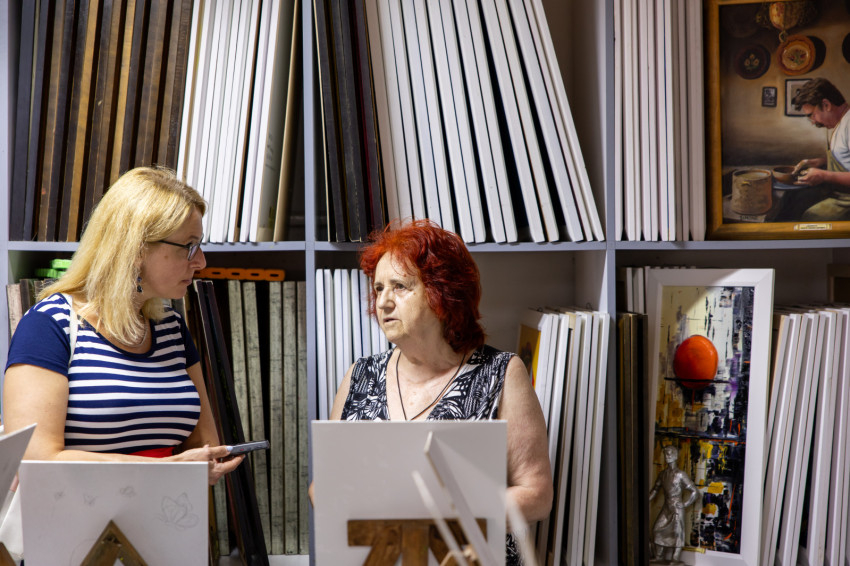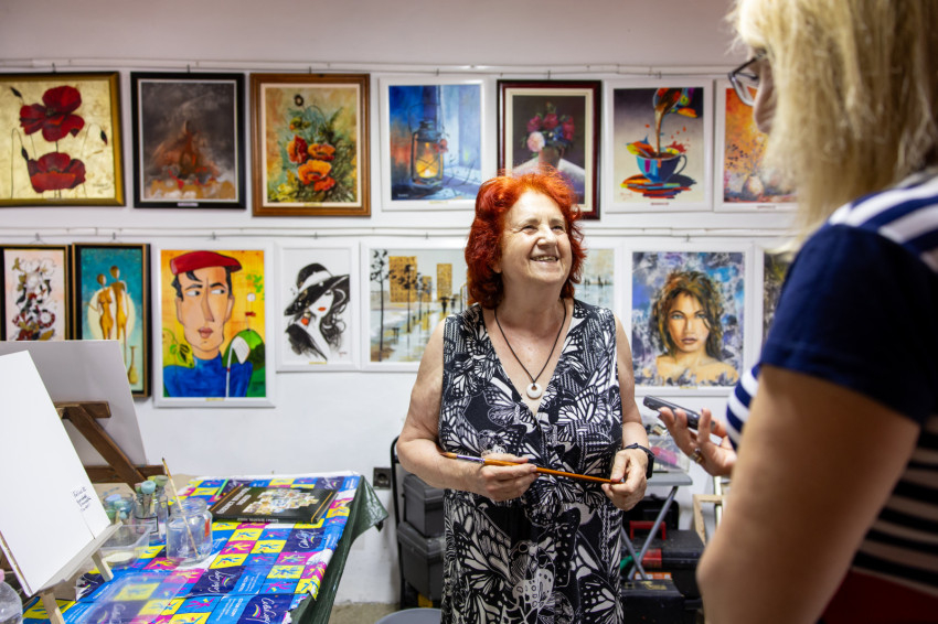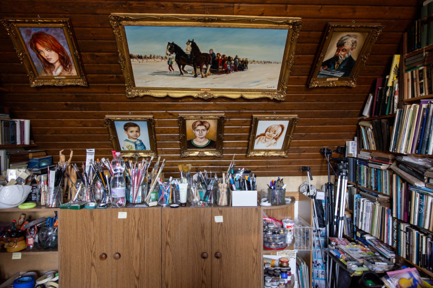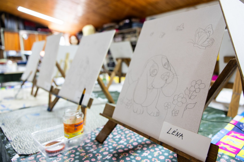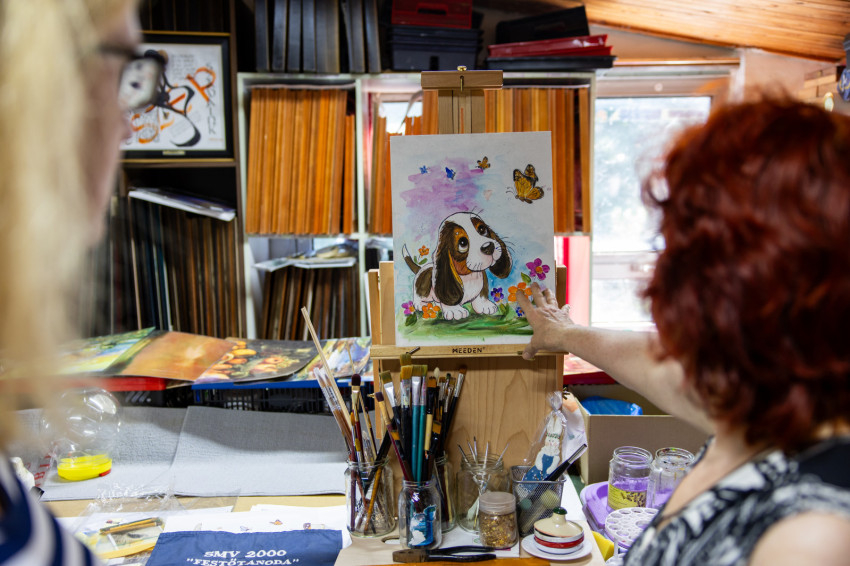 A kis műhely telis-tele festményekkel, a polcokon mint a könyvek sorakoznak a keretezett képek. A falon egyetlen négyzetméternyi hely sincs már, az asztalra pedig festővásznak vannak kikészítve szépen sorban, mintha a hét törpének lenne megterítve az asztal, csak éppen nem étkezéshez, hanem festéshez. „Itt, ebben a műhelyben tanítom a gyerekeket. Mindig előre megfestem nekik a mintaképet, most ez a kutya lesz a következő foglalkozás témája, ezt választották. A kicsik utánozzák a kutyaformát, de minden mással ők egészítik ki a festményüket, a színvilágban is engedem, hogy kiteljesedjenek.”