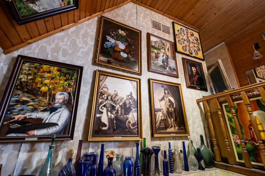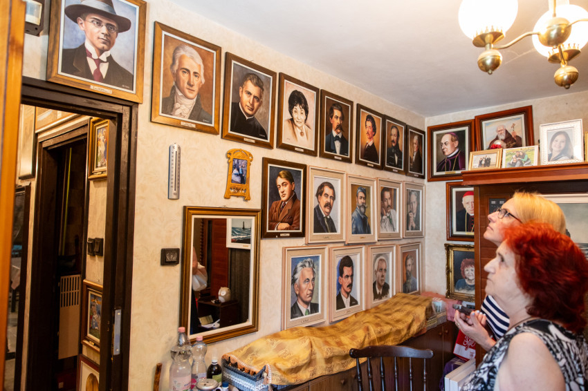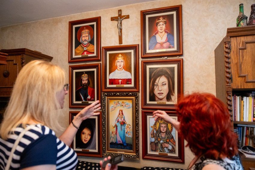 Bemegyünk a házba, ahol már az előtér és a lépcsőforduló is tele van festményekkel. Itt kaptak helyet a pápaképek is, többféle verzióban, pasztellképek, amelyek Veronika szerint csak vázlatok. „Az igazi festmény nekem az olaj. Amikor a Louvre-ban láttam, hogy 1600-ból is vannak pasztellképek, egészen megdöbbentem. Temperával készült az első művem, de mindenféle technikát szeretek, még borral is festünk.”