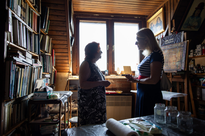 Veronika megmutatja a diplomáját, Salzburgban végezte el a Leonardo Kunstakademie mesterképzését. Mivel mindig újabb és újabb technikákat keres, így sokat jár külföldre is, Németországba, Ausztriába, Svájcba, Szlovákiába. Elmondja, hogy sorozatot festett a régi mesterségekről, mint amilyen például a keramikus, a könyvkötő. Ha rátalál egy témára, nem tudja abbahagyni, míg sorozattá nem fejlődik. Így több mint hatvan képe született a mesterségekről, közülük húszat a szülőfaluja, Csetény tájházának adományozott.