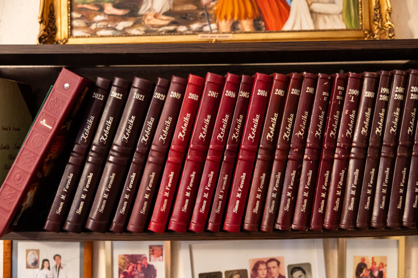 El is meséli, hogyan készült az első pápakép. „A Szent István-bazilikában volt egy százképes kiállításunk. Kiss Géza atya ideszólt, ha már úgyis ott vannak a bazilikában Veronika egyházi képei, nem vállalná-e, hogy megfesti II. János Pál pápa portréját a kőbányai lengyel egyházközségnek, amelynek már szentekről is készített képeket. Mennek ki a Vatikánba a kőbányai lengyelek, XVI. Benedek pápa fogadja őket, és szeretnék megajándékozni őt ezzel a festménnyel. Két héttel később aztán szóltak Veronikának, hogy fesse meg XVI. Benedeket is, mert hogy néz ki, hogy csak a lengyel pápa képét viszik ajándékba az új pápának. Így egyszerre készült a két kép. Veronika kiment velük a Vatikánba, soron kívül fogadta Benedek pápa a lengyelekkel. XVI. Benedekről aztán több helyre is készített képet, a halála utáni szentmisén Veronika festményét helyezték ki róla a Szent István-bazilikában. 1997-ben Veronika egy Apor Vilmos-festménye is kikerült a Vatikánba; a püspökről összesen kilenc képe van a Kárpát-medencében és Varsóban. Nemrég készült el Snell püspök képe, és megfestette Erdő Pétert is, majd Leó pápát” – mondja Béla, közben pedig megmutatja Veronika Krónikáját, amelynek köteteit 1994-től kezdve maga szerkesztette és tördelte. Látszik, hogy amióta Veronika fest, ő ott áll mögötte. Ugyanakkor az alábbi kis civakodós, nevetgélős történetmesélésből az is kiderül számomra, hogyan zajlik ez a mindennapokban.