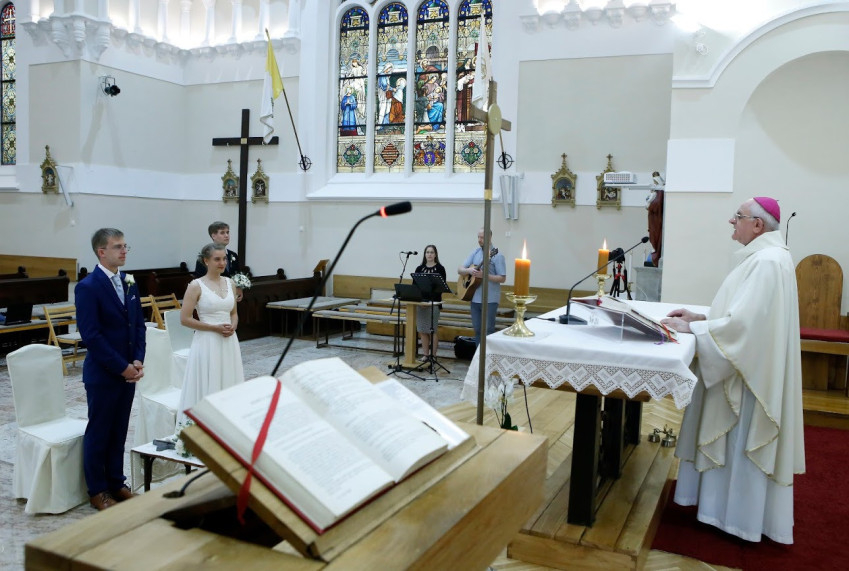 A jegyespár és a két tanú egymástól biztonságos távolságban elhelyezett, hófehér székeken ült. A falnál a két zenész állt, szemben Varga László püspök, az első padsorban pedig egy fiatalember egy laptoppal. Ez volt az az eszköz, amelynek segítségével a vírus miatt ilyen „minimalista” esküvőt tartó fiatal pár minden szerettüket be tudta „kapcsolni” életük egyik legfontosabb eseményébe, amikor örök hűséget esküsznek egymásnak Isten szent színe előtt.