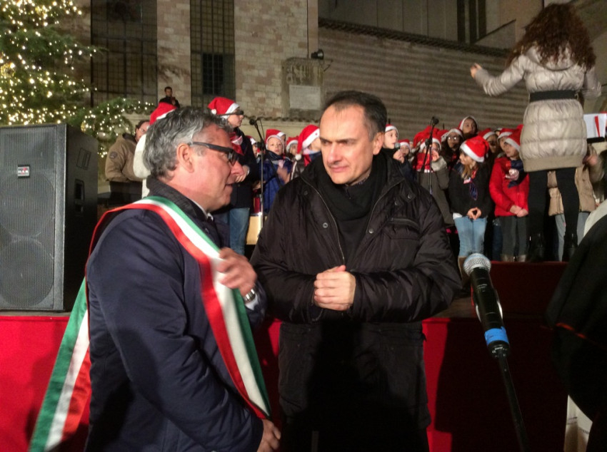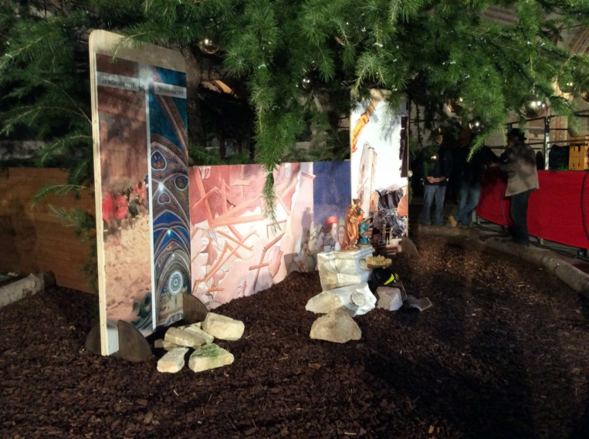 Október 30-án érte utol a közép-olaszországi Norcia városát az a nagy erejű földrengés, amelyben leomlott a Szent Benedek-székesegyház. Szent Ferenc városában a betlehemi jászol építéséhez a bazilika köveit használták fel, a megszülető Jézus bölcsője pedig egy tűzoltósisakból készült. A 14 méter magas karácsonyfát Piemont régió ajánlotta fel, szintén a földrengés sújtotta Valnerina völgyből származik.