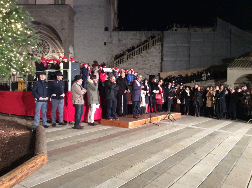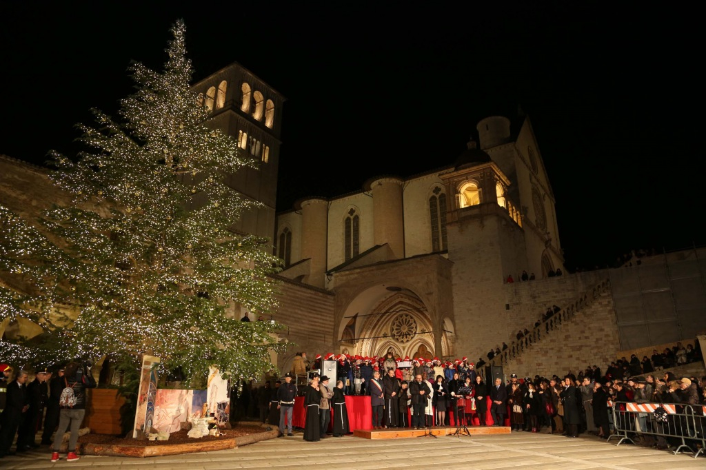 December 8-án 17 órakor Peter Turkson bíboros, az Átfogó Emberi Fejlődés Előmozdításának Dikasztériuma prefektusa mutatott be szentmisét a Szent Ferenc-székesegyház alsó templomában. A szentmise után Mauro Gambetti, az assisi szent konvent kusztosa megáldotta a betlehemi jászlat és meggyújtotta a karácsonyfa fényeit – „hogy megvilágítsák ezt a konfliktusoktól és természeti katasztrófáktól sújtott világot”. Az eljövendő Úrról úgy beszélt, mint aki azért jön, hogy megvilágítsa életünk történéseinek rejtett jelentését, megmutassa az események mélyét, és megmutassa a béke útját.