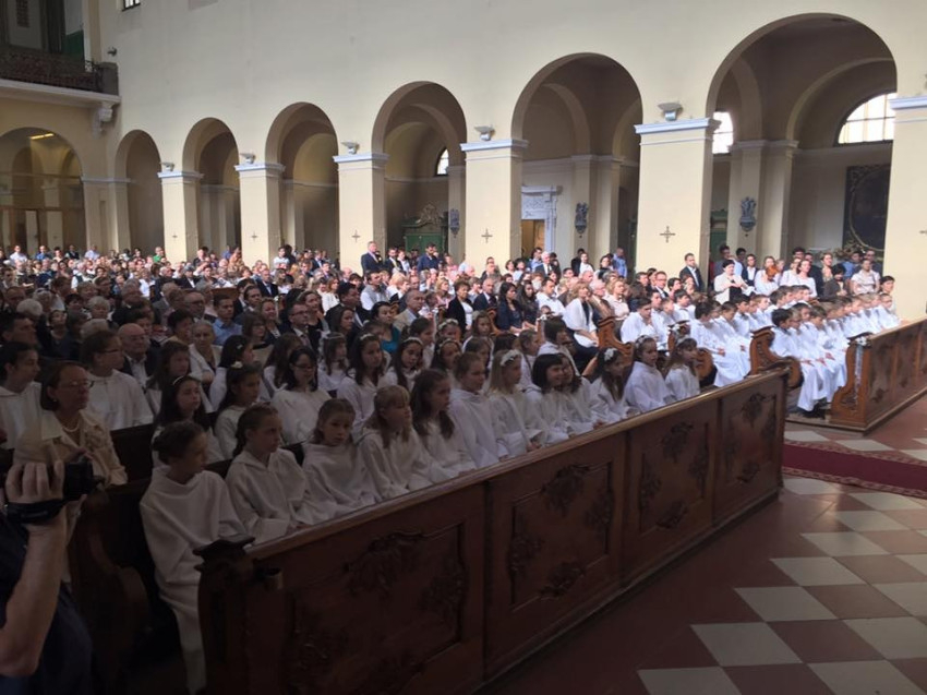 A Budai Ciszterci Szent Imre-plébánián ma, május 28-án ünnepelték az elsőáldozást. Hetvenegyen találkoztak először az Úr Jézussal az Eucharisztiában.