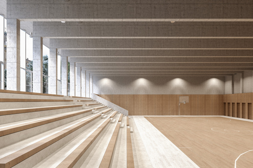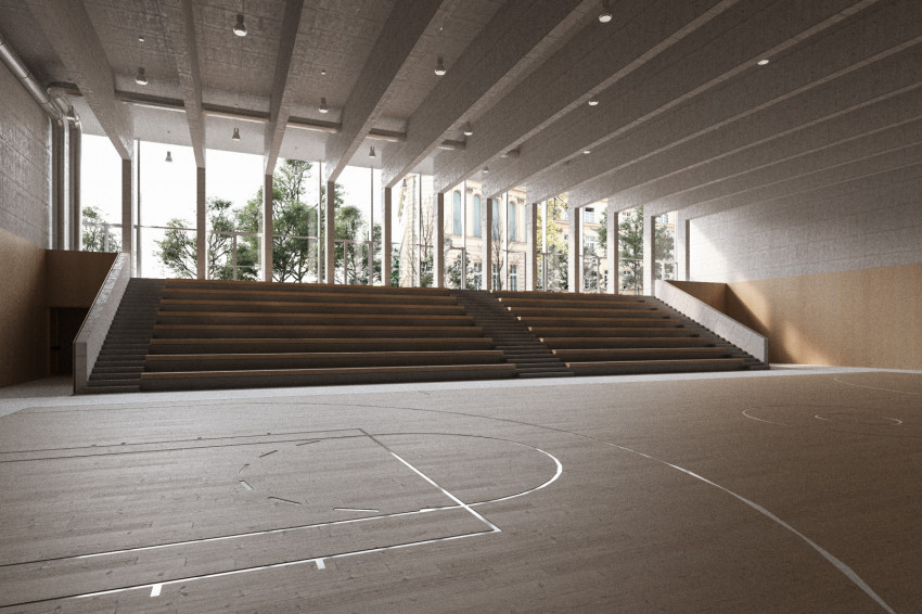 Az sportcsarnok épületének koncepcióját elsősorban a telken való elhelyezkedése határozta meg. A gimnázium mögött elegendő hely állt rendelkezésre a tervezett létesítmény befogadásához, amit a terület lejtőssége miatt süllyesztve, földbe integrálva lehetett jól megvalósítani. Az építményt a domboldalba rejtették; a sportcsarnok hátsó része már teljesen a föld alá került. A sportcsarnok különleges kialakítása révén építészeti szempontból is kivételes.