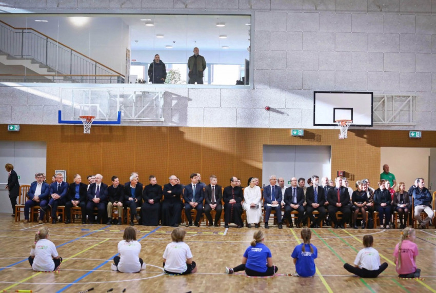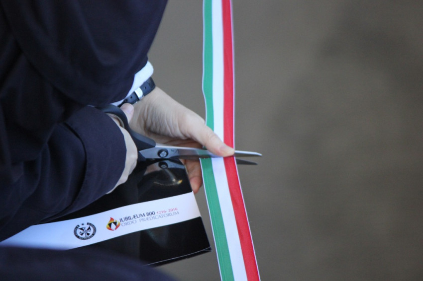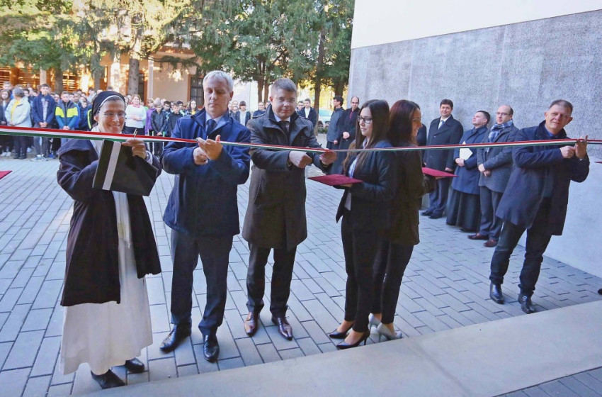November 14-én délelőtt érkezett el a várva várt pillanat. A tornateremben sportruhába öltözött diákok, a bejárata előtt vendégek gyülekeztek. Kakucs Petra nővér, az intézmény igazgatónője és Deák Hedvig nővér, a Domonkos Nővérek általános főnöknője – mint fenntartó – a kifeszített nemzeti színű szalag előtt üdvözölte Székely János szombathelyi megyéspüspököt, Soltész Miklóst, a Miniszterelnökség egyházi és nemzetiségi kapcsolatokért felelős államtitkárát, Ágh Péter országgyűlési képviselőt, Básthy Béla alpolgármestert, Harangozó Vilmos esperes-plébánost, valamint Kőszeg város és a megye több oktatási intézményének képviselőit.