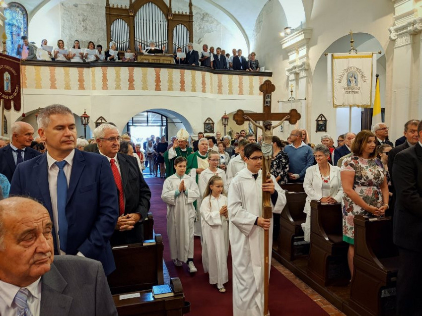 A szentmise elején a plébániai tanácsadó testület alelnöke köszöntötte a főpásztort, a város polgármesterét és a megjelenteket, majd a püspök is köszöntötte a résztvevőket. Megjegyezte, csodálkozva nézte, mennyire gyönyörű lett a templom és környezete. „Mátyás király módjára” egy héttel korábban már átutazóban meggyőződött róla, az átalakítások megfelelő módon zajlottak, és bizakodóan várta a hivatalos átadás időpontját. Tiszteletét és elismerését fejezte ki végül mindenkinek, aki a munkában bármilyen módon részt vett. A szentmisét a jelenlévőkért és szeretteikért ajánlotta fel. „Biztos vagyok benne, hogy a templom és környezete a testi-lelki felüdülést keresők számára a béke szigete lesz” – fogalmazott köszöntőjében.