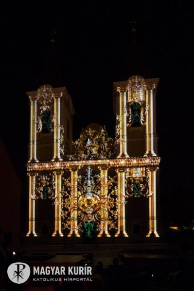Az épület 800 éves történetét és a hozzá kapcsolódó egyházi és világi személyeket bemutató látványos műsor három részből állt. Az első egység a világot teremtő Mindenható Istennek való hálaadásról szólt, melyet köszönetnyilvánítás és tiszteletadás követett a templom építését, felújításait lehetővé tevő támogatóknak és az építőnek. Ekkor jelenítették meg a templom homlokzatán az északi toronykeresztben idén megtalált időkapszulába rejtett dokumentumokat. A következő részben a székesegyház épületének története elevenedett meg. A közönség a középkori templom építését, majd a török hódoltság alatti részleges pusztulását, valamint a kora újkori újjáépítés küzdelmeit láthatták. Lenyűgöző volt a déli torony 1742-ben történt leomlásának megjelenítése. A vetítés harmadik részében feltűntek Szent István, Szent Imre és Boldog Gizella, vagyis a Magyar Szent Család ereklyéi, valamint a székesegyházban különösen tisztelt szentek ábrázolásai. A leromlott állapotból átalakuló, megújított épület látványa zárta a produkciót.