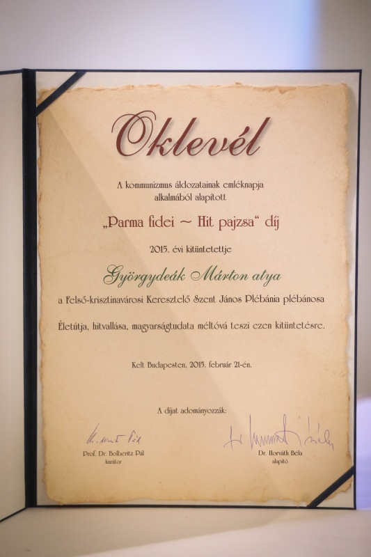 A kommunizmus áldozatainak február 25-ei emléknapjához kapcsolódó kitüntetést 14. alkalommal adta át Mádl Dalma, Mádl Ferenc volt köztársasági elnök özvegye. Az ünnepség résztvevőit Spányi Antal székesfehérvári megyéspüspök áldotta meg, Erdő Péter esztergom-budapesti érsek képviseletében Monostori László irodaigazgató-helyettes, a kormány nevében Soltész Miklós egyházi, nemzetiségi és civil társadalmi kapcsolatokért felelős államtitkár vett részt az ünnepségen.