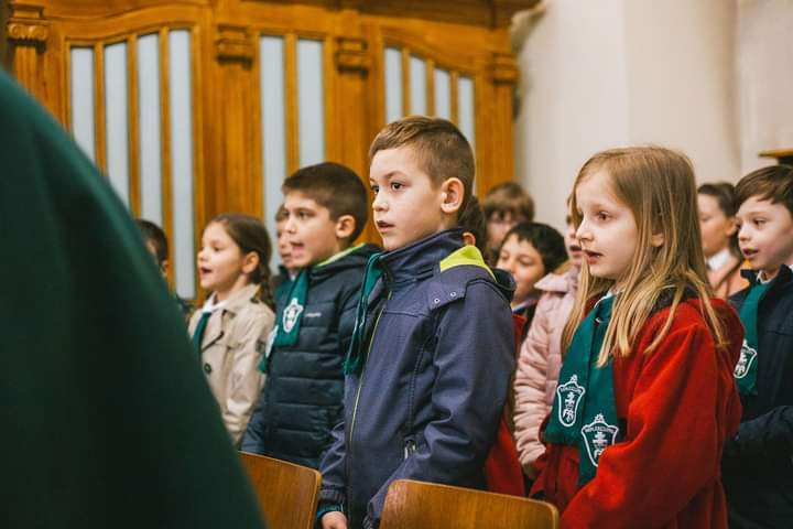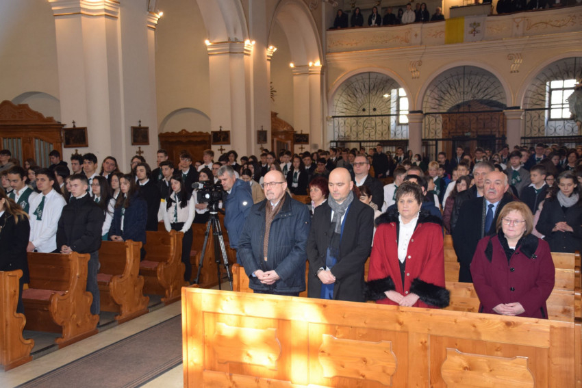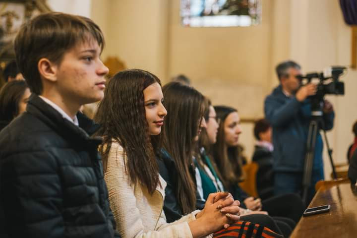 Mivel az iskola közössége már nem fér el egyszerre a templomban, az általános iskolások a Deus Providebit Tanulmányi Ház nagytermében kivetítőn követték a szentmisét.