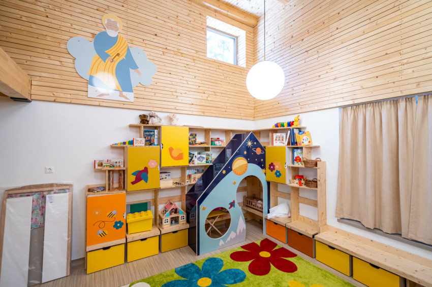 Az óvoda központi épülete és az új épületrészben helyet kapó csoportszobák közvetlen kertkapcsolattal rendelkeznek, kedvező tájolással és racionalizált kialakítással. A katolikus szellemiség erősítésére kápolnát is kialakítottak.