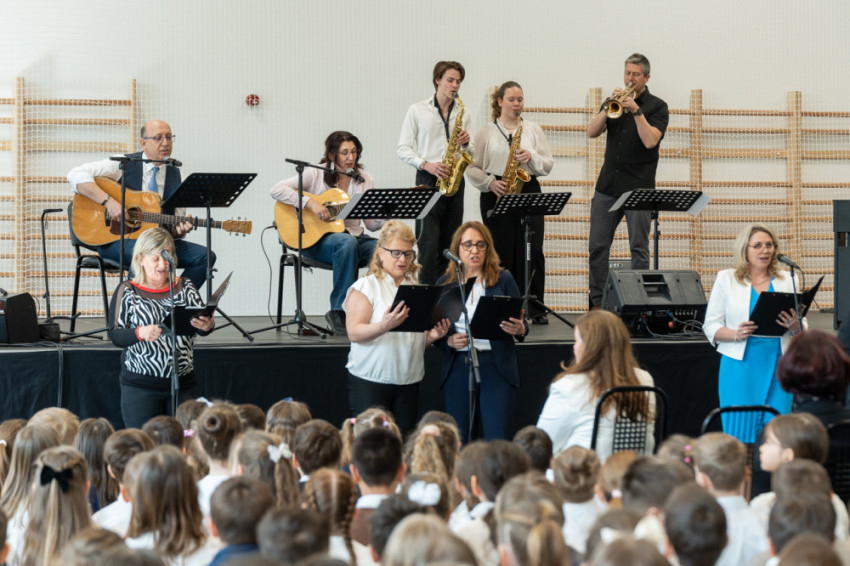 Végezetül a pécsi megyéspüspök az új tornacsarnok rögtönzött színpadára invitálta a tantestület tagjait, és példaértékűnek nevezte a tanárok tisztes helytállását az évtizedeken át tartó méltatlan körülmények közepette.