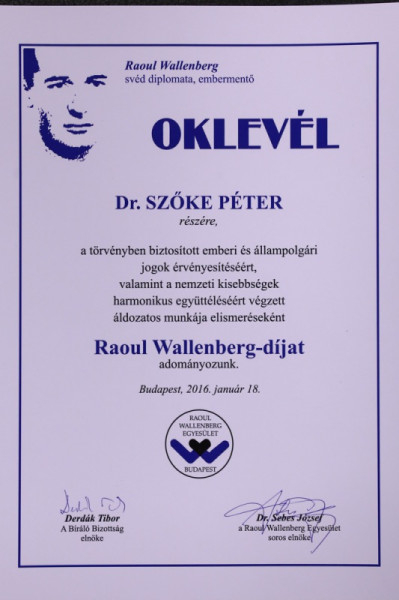 A laudációkat Derdák Tibor, a Wallenberg-díj bírálóbizottságának elnöke olvasta fel. Erdő Péter bíboros ajánlására Szőke Péter, a magyarországi Szent Egyed közösség vezetője kapta a díjat. Laudációjában a bizottság kiemelte: „Huszonöt év óta aktív tagja és tíz éve vezetője a magyarországi Szent Egyed közösségnek. Szőke Péter a legszegényebbek, a hajléktalanok, a szociális otthonokban élő idősek, a cigányság gondjaira keresi a válaszokat. A közösség önkénteseivel rendszeresen látogatja a hajléktalanokat, ruhával, étellel, törődéssel segíti őket.