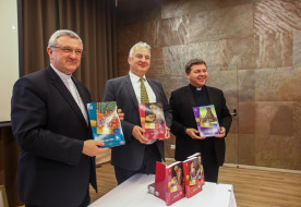 (A képen Veres András, a Magyar Katolikus Püspöki Konferencia (MKPK) elnöke, Semjén Zsolt miniszterelnök-helyettes, valamint Tóth Tamás, az MKPK titkára a Szent István Társulat kiadásában megjelent tankönyvsorozat eddig megjelent köteteivel.)
