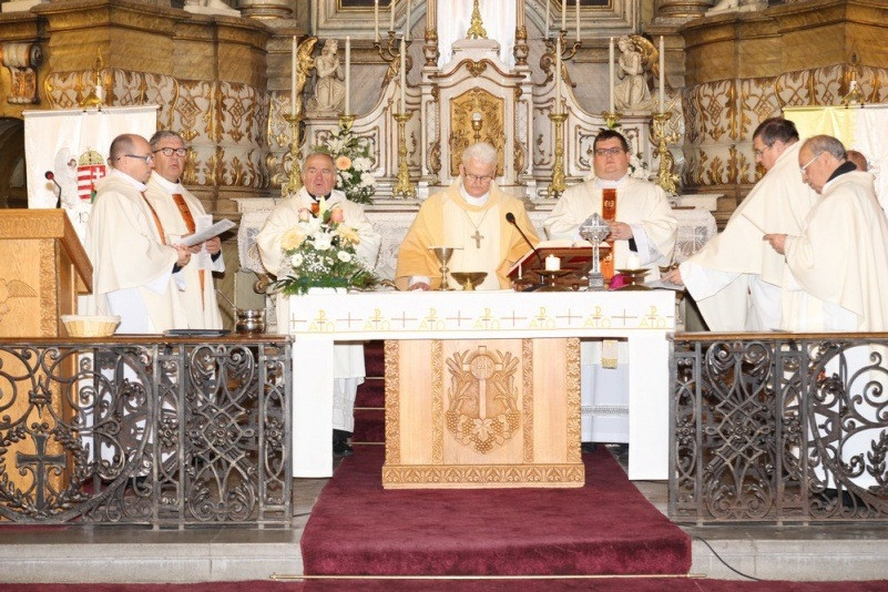 Az 1777-es egyházmegyei alapítással székesegyházi rangra emelkedett a belvárosi plébániatemplom, amelyet Farkas Imre hagyatékából renováltak, és 1866. november 25-én Simor János győri püspök, Fehérvár szülötte szentelte fel. Shvoy Lajos püspök kezdeményezésére 1938-ban a templom kisbazilika rangot kapott – idézte fel a főtemplom történetét a megyéspüspök. Majd arról beszélt, egyre több hír érkezik bezárt vagy elpusztított templomokról, az oda járó keresztények üldözéséről. „Hálát kell adnunk, hogy Szent István városában különös helyet foglal el a székesegyház az emberek életében. És jó látni, hogy országszerte mindenfelé örülnek az emberek, ha egy templom megszépül, megújul.”