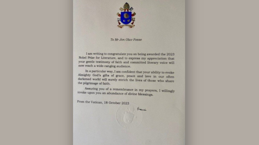 Jon Fossénak Ferenc pápa is gratulált, a rövid üzenet idén október 18-án érkezett meg, és a norvégiai katolikus egyház honlapján is megjelent. „Azért írok Önnek – áll a pápai üzenetben –, hogy gratuláljak a 2023-as irodalmi Nobel-díj odaítéléséhez, és hogy kifejezzem nagyrabecsülésemet, amiért a hitről szóló finom tanúságtétele és elkötelezett irodalmi hangja most szélesebb közönséghez jut el. Különösen biztos vagyok abban, hogy az Ön képessége, hogy felidézze a mindenható Isten kegyelmét, békéjét és szeretetét a mi gyakran sötét világunkban, gazdagítani fogja azok életét, akik osztoznak a hit zarándokútján. Biztosítom Önt, hogy imáimban megemlékezem Önről, s szívemből kérem Önre a mennyei áldások bőségét” – írta neki Ferenc pápa.