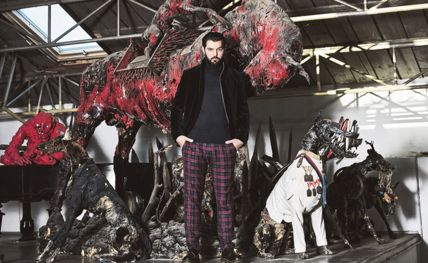 – Sokáig, tudat alatt lappangott bennem. Úgy kezdődött, hogy egyetemistaként vettem egy kutyát. Egy dobermannt. Elneveztem Danténak, mert illett rá. Kinézetre klasszikus kutyaforma: hegyes fülek, hosszú orr, izmos, arányos testalkat... Sokat mozgó, nagyon dinamikus fajta. Kicsit félelmetes is. Sötét, mély színei, titokzatossága miatt hozzá passzolónak éreztem a „plasztikus” Dante nevet. Hónapok teltek el: Dante jól elvolt, hoztam-vittem magammal. De annyira különleges volt a külleme és a viselkedése, hogy egyszer csak elkezdtem lerajzolni. Jól nézett ki, ahogy a régi bútorok között, a szőnyegen pihen. Eszembe jutottak róla az ősi ábrázolások, például az egyiptomi Anubis, a pompeji mozaikon látható kutya. Dante a rajzokon keresztül más időkbe vitt el; valahogy időtlenné váltak a vele kapcsolatos dolgok. Szabadon választott anyagokból formáltam meg életnagyságú kutyaszobrokat. Az egyetemen PET-palackokat gyúrtam össze, átragasztószalagoztam, körbetekertem a figurákat, úgy, hogy nem is lehetett rájönni, miből készültek. Messziről teljesen élethűnek tűntek. Az egyik szobor nem sikerült. Nem tetszett. Dühös lettem, annyira, hogy elkezdtem „lerombolni”. Ilyenkor már nehezen, csak nagy erővel, nehéz súlyokkal változtatható ez a tömörített anyagból kialakított forma, úgyhogy átmentem rajta az autó kerekével. És akkor jött létre a kutya legszebb formája. Aztán eszembe jutott: ha műanyag, akkor olvasszuk meg. A fekete szalag elkezdett égni, amitől olyan lett a forma, mint egy tetem, egy megszenesedett múmia. Ebből alakult ki a Dante-korszakomat elindító kutyaszobor. Rögtön összekapcsoltam az Isteni színjátékkal, a Pokollal is. Meg kellett járnia a poklot, hogy utána felépüljön, újra életre keljen. Dante egy magánmitológiát alakított ki bennem, és ez az „új kultúra” nemcsak rajzokban és szobrokban, hanem bútorokban, belsőépítészeti megoldásokban, fikciókban és koncepciókban is testet öltött. Évekkel később eszméltem rá, hogy egyféle rendszerben gondolkodom: elkezdtem mesét írni magamnak Dantéról.