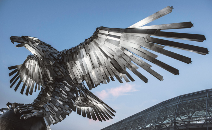 – E két madárszobor valóban mérföldkő az életemben, a hatásuk a mai napig meghatározó. Minden munka szép és fontos, de tény, hogy ez a kettő lépték és maradandóság szempontjából egyaránt kitűnik a többi közül. A Fradi-sas ötéves múlt, az Atlanta Falcons jelképe 2018-ban került az akkorra felépült szuperstadion elé. A sasra vonatkozó megbízáskor új szobrászati technológiát kellett kigondolnom, hiszen addig főleg fával dolgoztam. Gyerekkoromtól inspirált a tatabányai turulmadár. Gyönyörű, hatalmas szobor. Többször felmentem megnézni, méregettem a léptékét. De persze nem azt akartam lemásolni. A modellezés és a gondolati anyagkísérletezések közben jutottam el a rozsdamentes acélhoz. Az épített környezethez, a stadionhoz nem is illett volna a bronz. Egy külön világ tárult fel számomra, különböző fémműves szakmákkal, mérnökökkel, alvállalkozókkal. Mély víz. Komoly csapatmunkát kezdtem menedzselni. Ki kellett találni a vázat, a figura statikáját. Egy 80-szor 80-as (betonlabda) pont tartja meg a tizenhat méteres szárnyfesztávú, több mint tizenhat tonnás madárszobrot. Tényleg ikonikus mű született, ez alapján ismertek meg igazán itthon. Az amerikaiak érdekes módon nem ezt a munkámat látták először, hanem a maszlenyica ünnepre, a moszkvai Gorkij parkba készített medvémet. Egy performansz keretében a telet jelképező faburkot leégettük, és ebből „szabadult ki” ez a bizonyos acélmedve. Sokfelé írtak erről az eseményről a világban, a The Wall Street Journal, a China Daily és a Die Welt is a nap híreként hozta. Az amerikaiak ezután kerestek rám a neten, és a Fradi-sast látva vették fel velünk a kapcsolatot. Atlantában akkor épült az Egyesült Államok egyik legkomolyabb stadionja, amelyet a 2019-es Super Bowlra nyitottak meg. A főbejárat elé szerettek volna egy szobrot, és megkérdeztek: volna-e hozzá kedvem? Először nem is hittem a fülemnek. Eljöttek Budapestre, megmutattuk a stadiont és a sast, körbevittük őket a városban. Még a hatalmas somorjai lószobromat is megnézték, amelyet Leonardo Kolosszusa inspirált. Több opciójuk volt, de akkor eldőlt, hogy engem választanak az atlantai sólyom elkészítőjének. Kétéves munkafolyamat volt. Egy évig tartott a szellemi rész: előkészítés, tervezés, a jogi procedúra lebonyolítása, a logisztika megszervezése. Aztán hét hónap itthoni alkotói munka, majd öt hónap kint az összeszereléssel. Jóformán csak magyarokkal dolgoztunk; ötven szakembert vittünk ki magunkkal több turnusban, akik a szoborállítás folyamatának különböző fázisait végezték el.