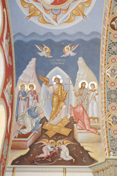 – A mai Magyarországon kevés az újonnan kifestett ortodox templom, viszont görögkatolikus templomainkban az utóbbi évtizedben több olyan képi program született, amelyben a föltámadási jelenet egész pompájában megjelenik. A közelmúltban kifestett székesegyházaink közül Miskolcon, Nyíregyházán és Debrecenben látható ilyen, monumentális formában. Nyíregyházán néhány évvel ezelőtt készült el a szemináriumi kápolna kifestése, amely Makláry Zsolt, időközben elhunyt ikonfestő munkája. Ebben a képciklusban is szerepel a poklokra való leszállás ikonja. A nyíregyházi székesegyházban Seres Tamás festőrestaurátor-művész, ikonfestő és csapata készítette el a nagyszabású Húsvét-ikont. Szintén ők dolgoznak a debreceni székesegyházunk kifestésén. Itt az északi kereszthajó boltozatán már elkészült ez a monumentális kompozíció. A jelenet a Jézus Krisztus feltámadása feliratot kapta, éppen annak tudatosítására, hogy a bizánci hagyomány a húsvét misztériumát ezen az ikonon keresztül szemléli.