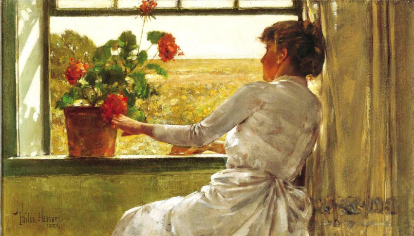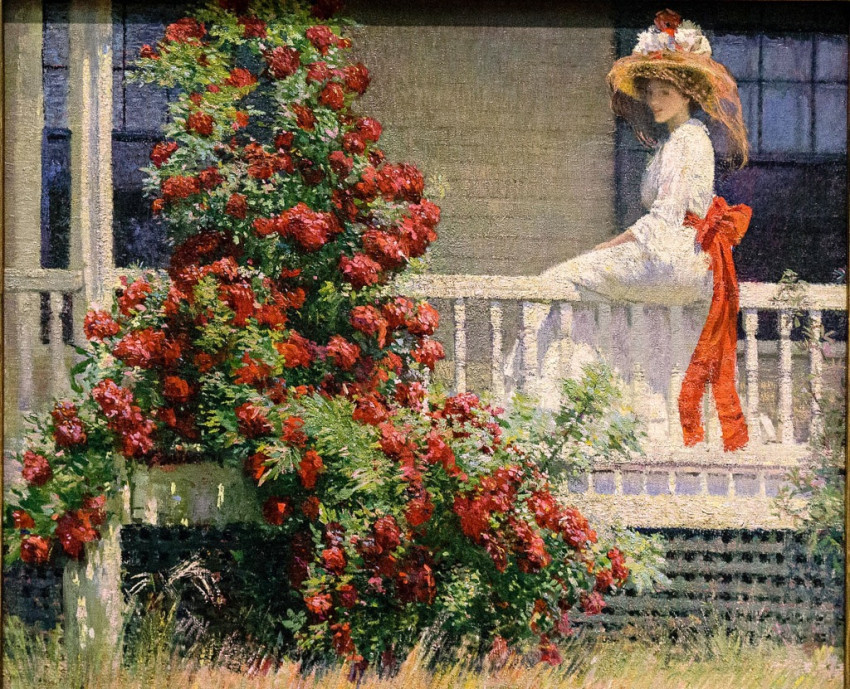 Különleges, Japánból származó vörös rózsabokor virágzik éppen egy connecticuti ház teraszán, a korláton egy fiatal hölgy ül hatalmas kalapban, fehér ruhában, mosollyal az arcán. Derekán – stílusosan – ugyancsak piros öv díszeleg, mintegy a rózsabokor ellenpontjaként. A képet Philip Leslie Hale festette 1908-ban, a Florence Griswold House környékén, az Atlanti- óceánhoz viszonylag közeli, romantikus vidéken, az Egyesült Államokban. Mi tagadás, számunkra nem igazán csengenek ismerősen ezek a nevek. Akárhogy is nézzük, Amerika messze van…