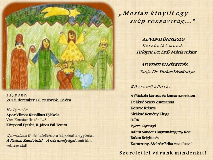 Nagyszámú diák és oktató vett részt az AVKF adventi lelkinapján. A főiskola vezetősége és munkatársai fontosnak tartják, hogy a színvonalas szakmai felkészítés mellett a diákok katolikus szellemiségű nevelést is kapjanak, hiszen ez segíti majd őket katolikus elkötelezettséggel gyakorolni hivatásukat, eligazodni a mai kor eszmei áramlatai között, és megtalálni a sokféle lehetőség között a katolikus egyház tanításának megfelelő utat, életformát.