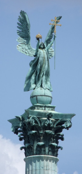 A fenti képen szemből láthatjuk Gábriel arkangyalt, a következőn pedig hátulról. Mindkét oldalán megfigyelhetjük a finom, aprólékosan részletező mintázást, amely mégsem túlzó, a mester nem esett a naturalizmus „bűnébe”. Zala György nem csupán ezzel a munkájával csillogtatja meg előttünk szobrászi kvalitásait, hiszen az oszlop mellett a hét vezér szobra is az ő műve.