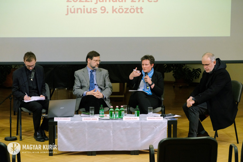 Az előadások után kerekasztal-beszélgetésre került sor, melynek Csiszár Klára, Zlinszky János, Benedek József és Nevelős Gábor SJ volt a résztvevője.