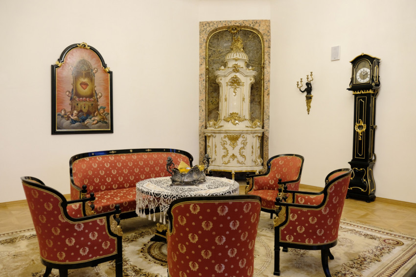 A palota állandó kiállításrészének első állomása egy sekrestye, pontosabban püspöki liturgikus ruhatár. Igazi különlegessége a 18. század elejéről egy festett, bőr miseruha. A dolgozószobát a székesegyház látványos, méretarányos makettje uralja. Mellette, a másik tárlóban a Pyrker által Egerbe hívott olasz szobrász, Marco Casagrande carrarai márványba faragott Keresztelő Szent Jánosa foglal helyet. A kihúzható fiókokban a bazilika építészeti dokumentációin túl közelebbről megvizsgálható Wolfgang Amadeus Mozart 1787-es – az egri Főegyházmegyei Könyvtárban őrzött – levelének fakszimiléje és Mikes Kelemen törökországi levelének reprintje. A kincstári darabokat felsorakoztató szoba közepén, az óriási üvegtetős asztalon egy tizennyolc kilós, arany és ezüst szálakkal kivarrt palást lett kiterítve. Mária Terézia ajándéka Erdődy Gábornak. A püspök vezette ugyanis a királynő pozsonyi koronázási menetét a Szent Márton-dómba. E reprezentatív ünnepi öltözetet a koronázáson viselt ruhájának anyagából készíttette el a hálás uralkodónő.