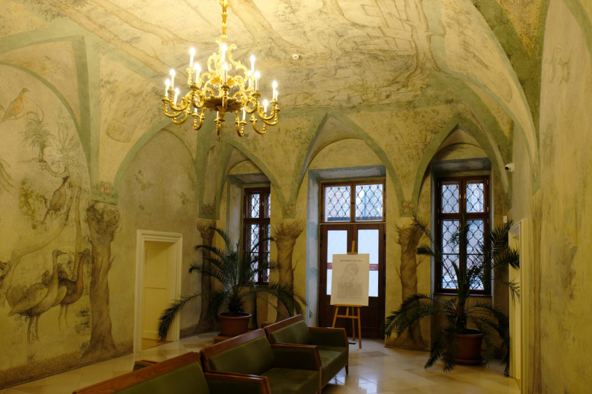 A kert palotán belüli folytatásaként megálmodott, építészeti szempontból gótikus és reneszánsz jegyeket magán viselő madaras terem természetközeli szekkóit több mint harminc festékréteg alól varázsolták elő a restaurátorok. Bél Mátyás 1733-ban már megemlítette ezt a különleges szobát, amelynek barokk tobzódású díszítése Erdődy püspök idején készülhetett.