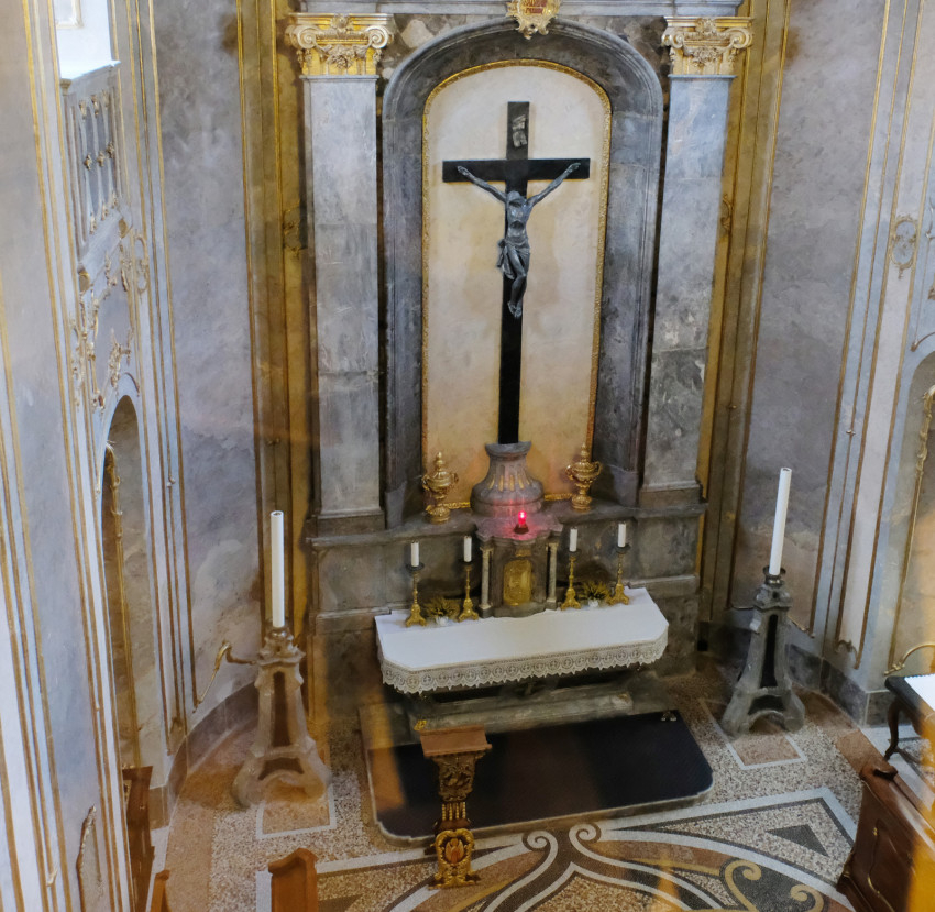 A palotalátogatás egyik csúcspontja a Szent Kereszt tiszteletére szentelt kétszintes érseki magánkápolna, amelyet a teremsor felől közelítve jól belátni az üvegablakos kóruskarzat magasából. A korpusz Johann Georg Leithner bécsi művész ólom Krisztus-szobra; a mennyezetkép, idősebb Storno Ferenc alkotása a gyermek Jézus és Keresztelő János találkozását jeleníti meg.