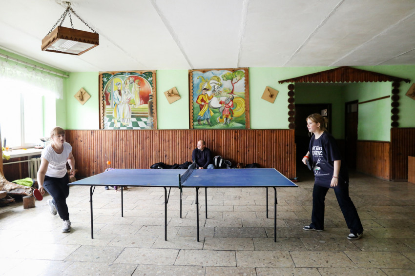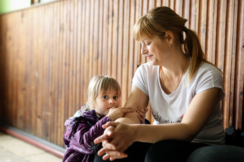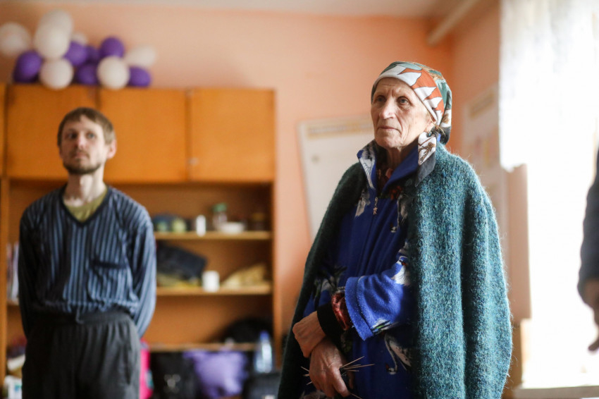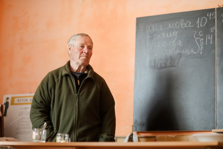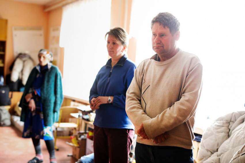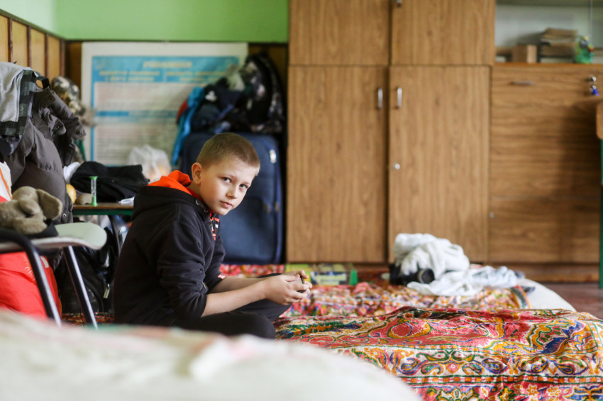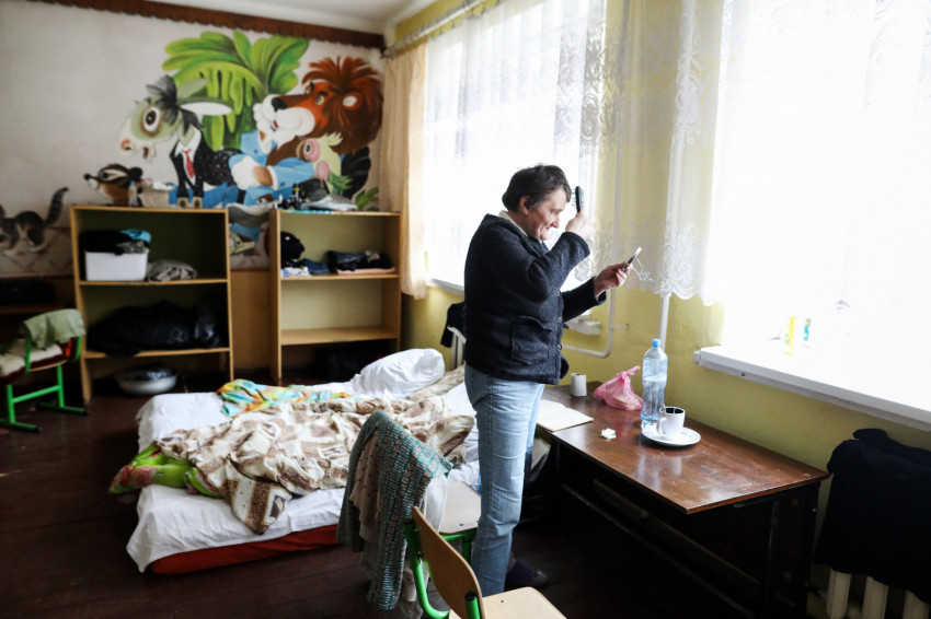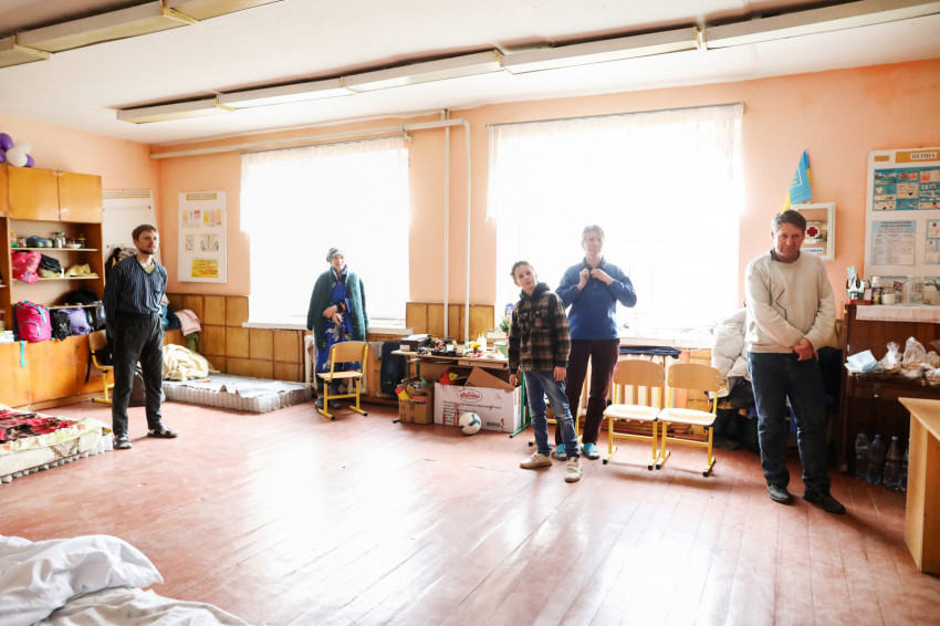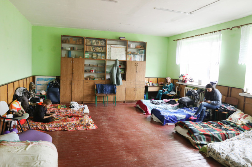 Az ukrán iskola épületében több mint hatvan menekült kapott szállást, többségében asszonyok gyerekekkel. Matracok, kempingágyak felállításával rendezték át az osztálytermeket hálótermekké. Egy termen általában több család osztozik, kivételt képez egy irpinyi nagy család. Három generáció érkezett együtt, a nagyszülők, a nagynéni és a szülők – az apuka is itt van – meg a gyerekek. Náluk is ugyanolyan szép rend van, mint mindenütt az egész épületben.Érkezésünkkor a házaspár magába roskadva ült, a nagymama a legkisebb fiúval beszélgetett. Március 8-a óta vannak itt.
