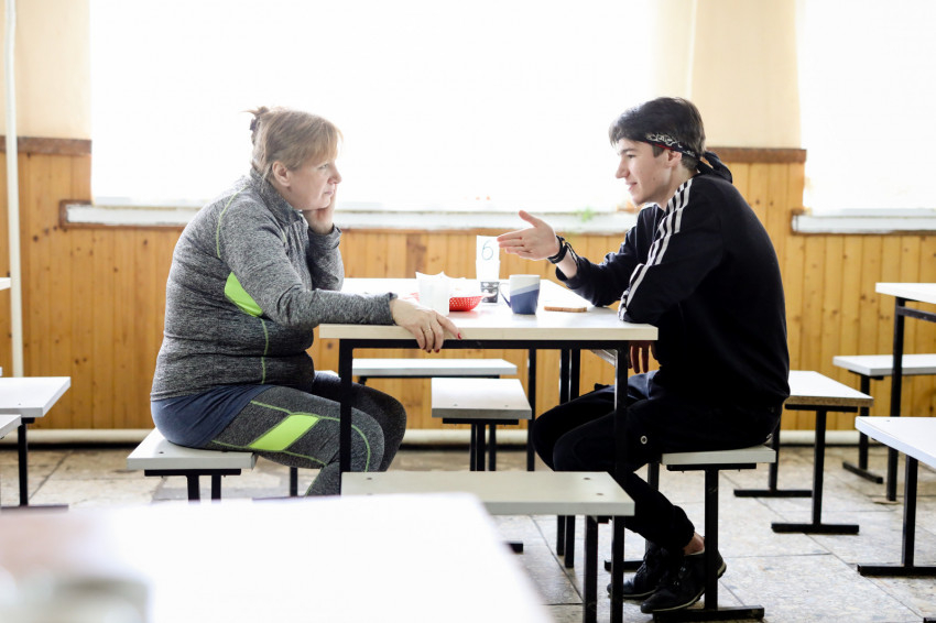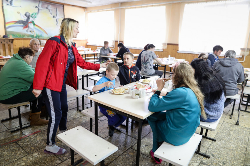 A konyhán háromszáz adag étel készül, a településen lakó időseknek, valamint a családoknál, illetve más közösségi szállásokon elhelyezett menekülteknek is biztosítják az ellátást. A szállítmány, amit a karitász hozott, Ilona, a konyhafőnök szerint nagyjából egy hónapra elegendő. Az ebédlőben már szépen meg van terítve, közeledik a vacsoraidő. Az asztalokon számok mutatják, ki hova ül. Itt is jól szervezett rend van. A terem lassan megtelik, vacsora közben az emberek halkan beszélgetnek.