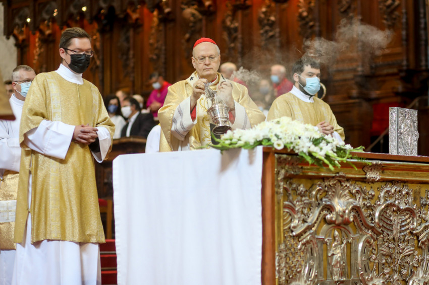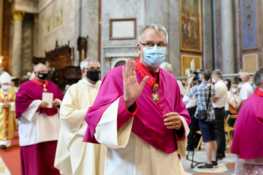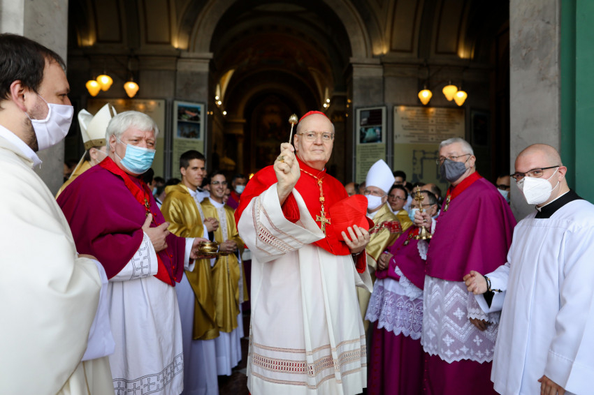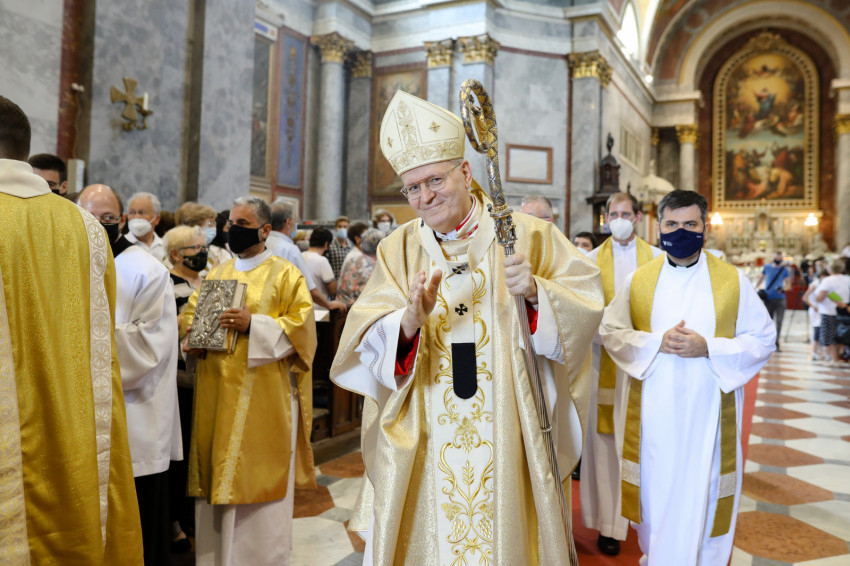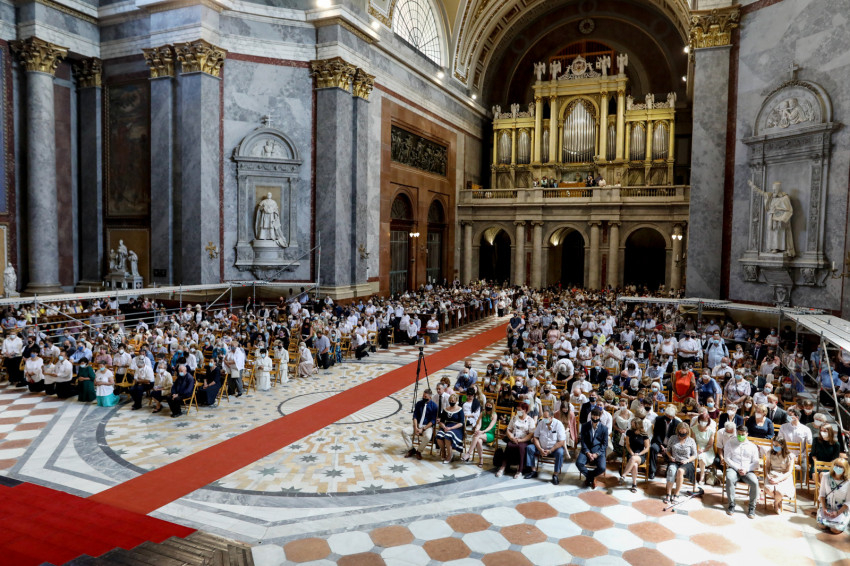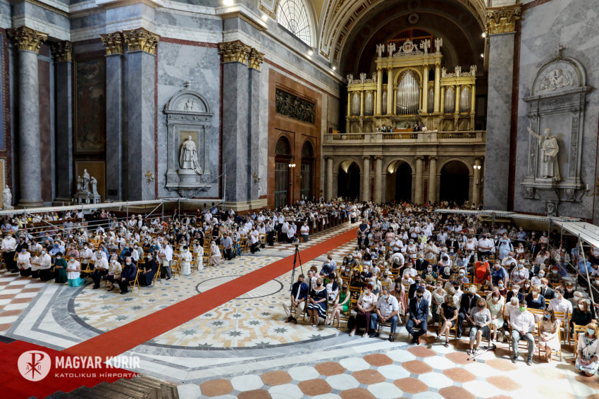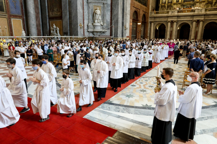 A bazilika orgonájának hangja töltötte be a templombelsőt, amikor az asszisztencia a bíboros fogadására vonult a főszékesegyház bejáratához. „Oltalmazó Isten, tekints le, és nézz fölkented arcára” – szólt a bevonulási ének, majd Erdő Péter köszöntötte a szentelendőket, a jubilálókat, és kifejezte örömét, hogy a járvány lecsengése lehetővé tette, hogy megteljen újra a bazilika ünneplőkkel.