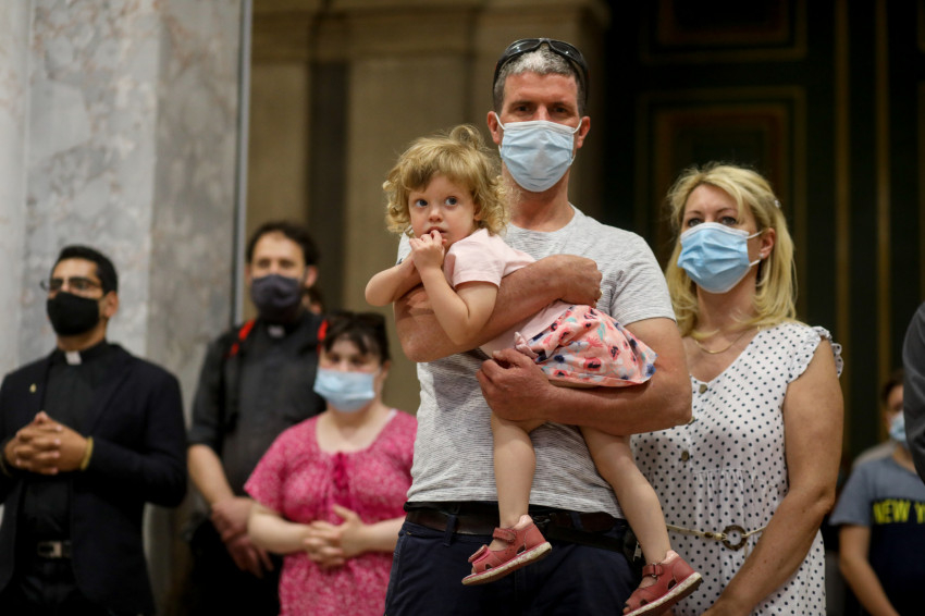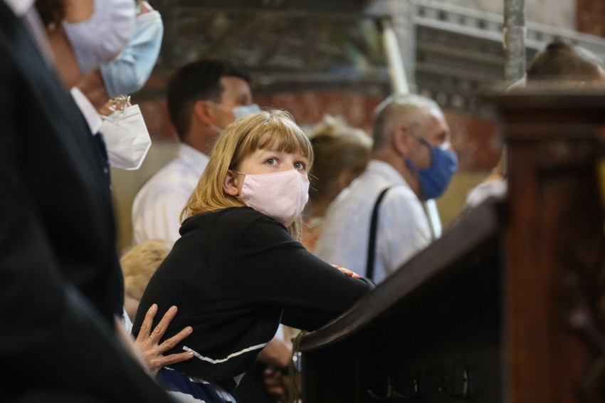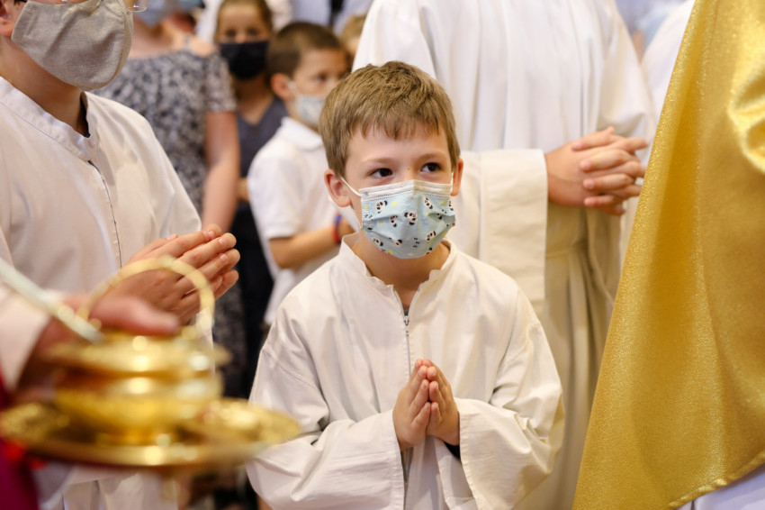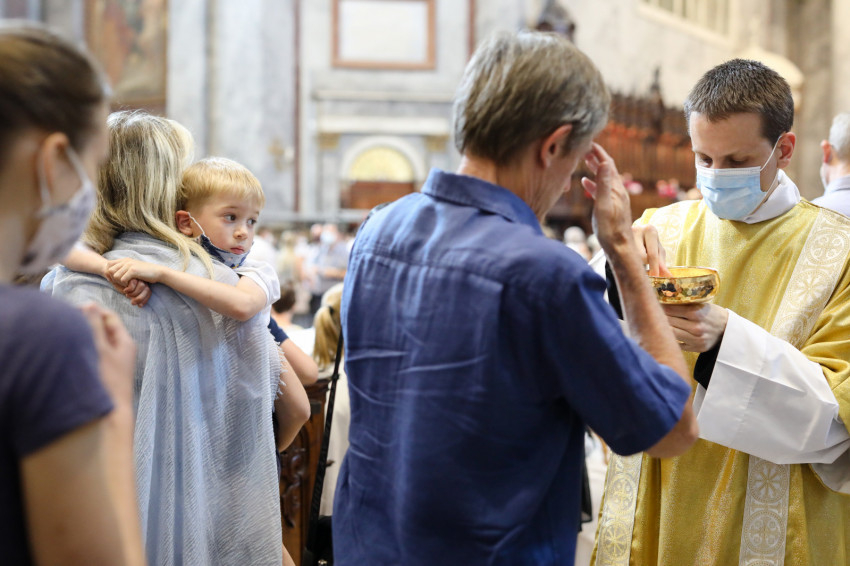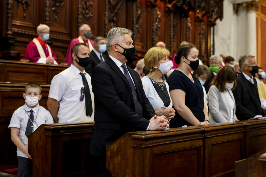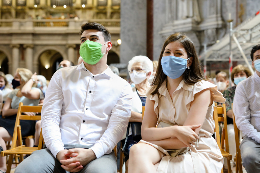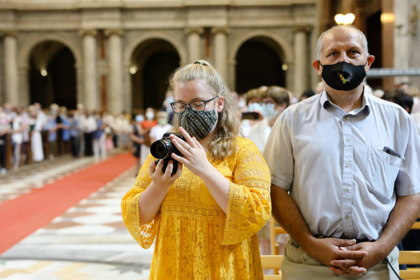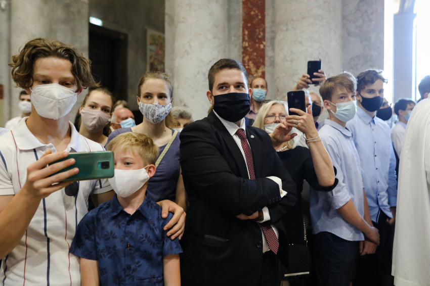 A bazilika orgonájának hangja töltötte be a templombelsőt, amikor az asszisztencia a bíboros fogadására vonult a főszékesegyház bejáratához. „Oltalmazó Isten, tekints le, és nézz fölkented arcára” – szólt a bevonulási ének, majd Erdő Péter köszöntötte a szentelendőket, a jubilálókat, és kifejezte örömét, hogy a járvány lecsengése lehetővé tette, hogy megteljen újra a bazilika ünneplőkkel.