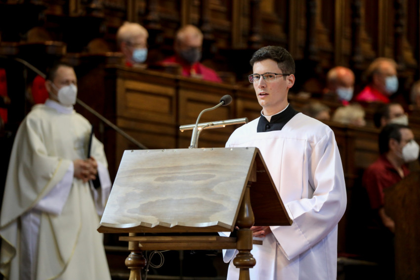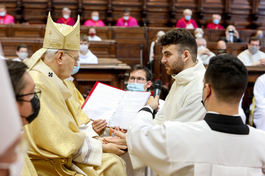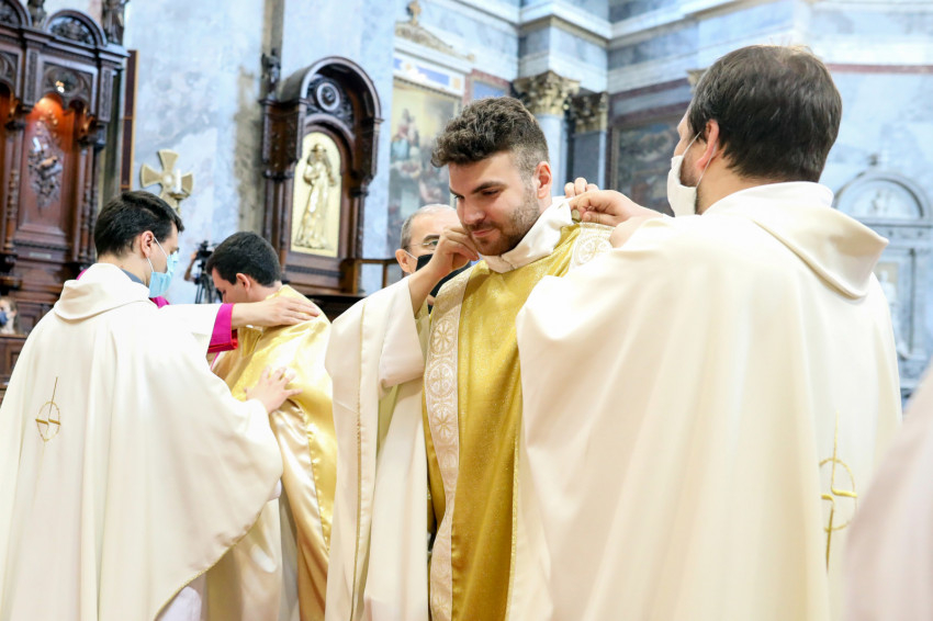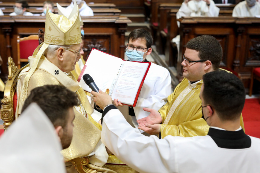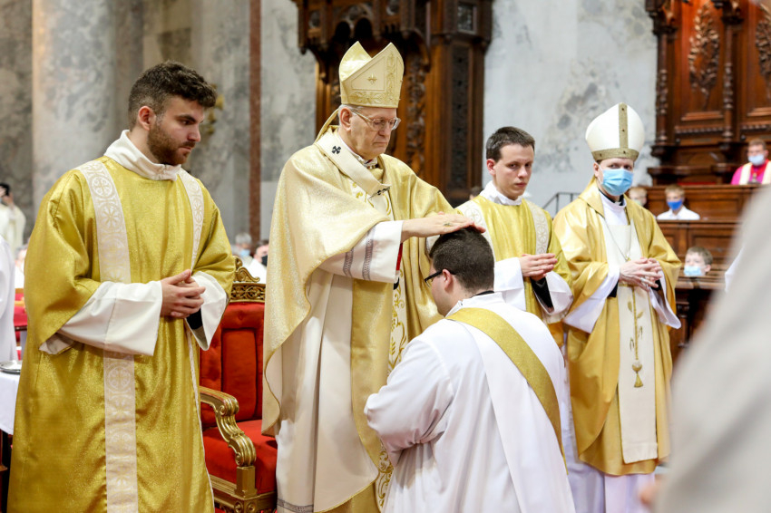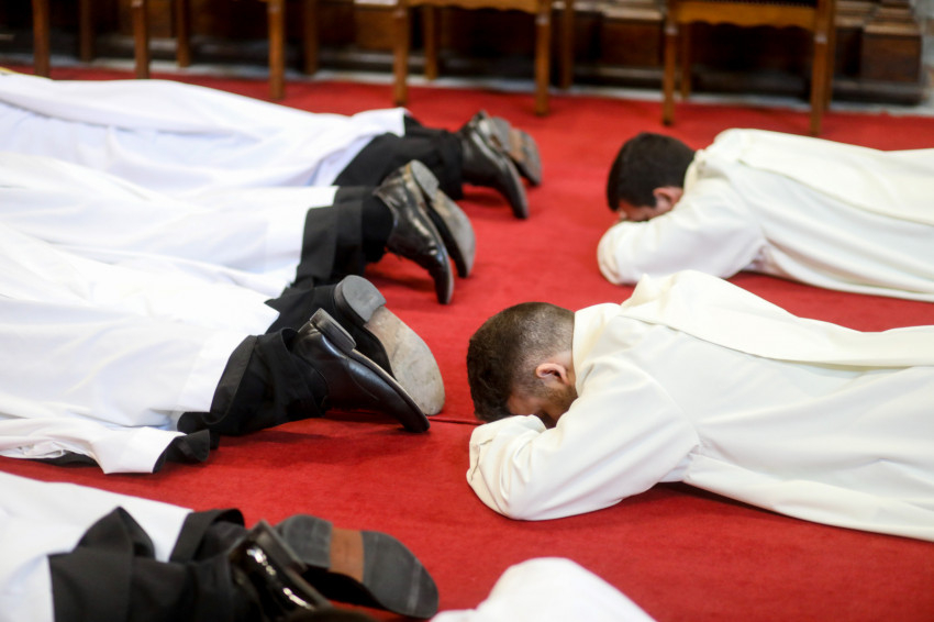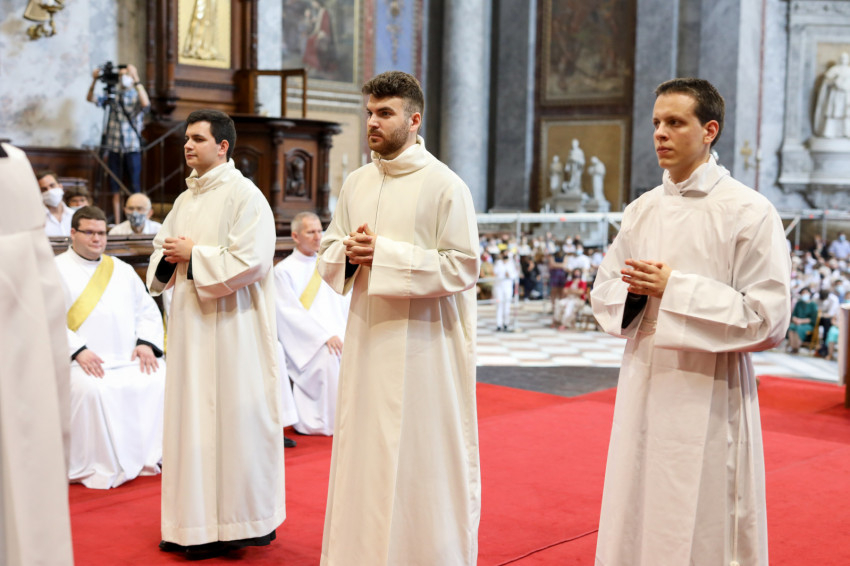 A Mindenszentek litániája alatt a szentelendők a földre borultak, kifejezve önátadásukat a szolgálatra. Majd a bíboros elsőként egyesével a diakónusokért imádkozott, hatalmat adva nekik a szerpapi tisztségre. Miután a három fiatalt dalmatikába öltöztették, megkapták az evangéliumoskönyvet: