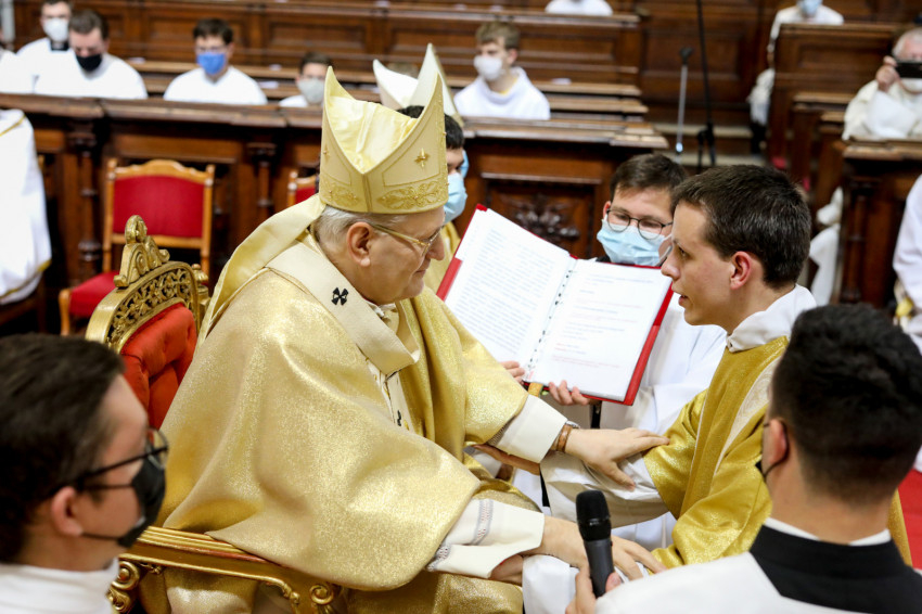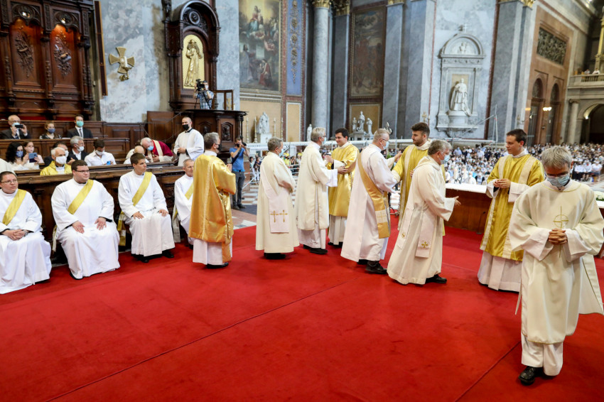 Ezután kapták meg a stólát és a miseruhát az Esztergom-Budapesti Főegyházmegye leendő papjai, majd a bíboros elmondta a felszentelés szavait, és megkente kezüket olajjal: