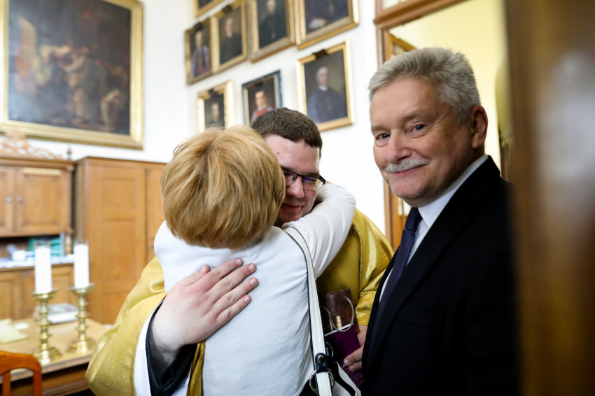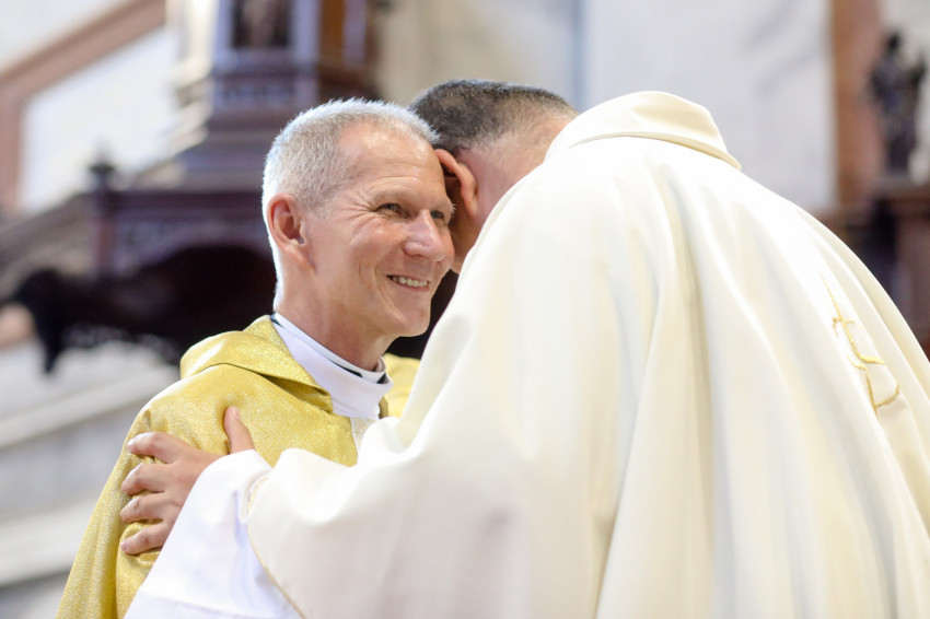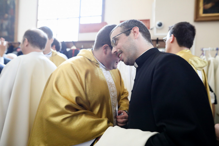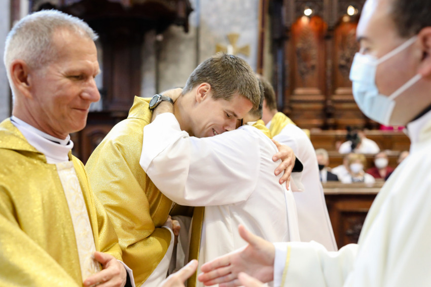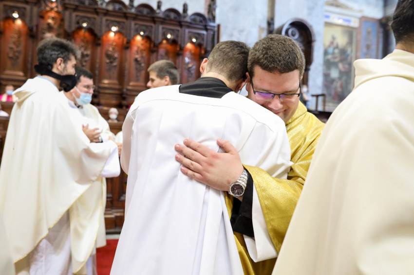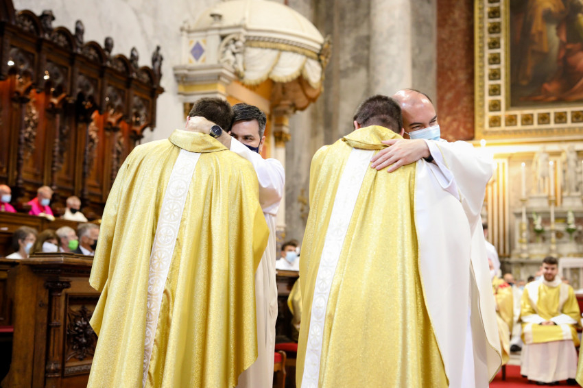 A bíboros békecsókot váltott minden újonnan felszentelt áldozópappal, majd a püspökök, kanonokok, jelen lévő papok köszöntötték őket, akik életüket most Jézusnak és a testvéreik üdvösségére adták.