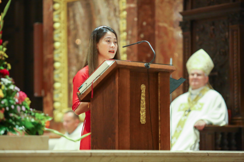 A szentmise alapvetően magyar nyelven zajlott, nem rejtve véka alá, milyen nehézségekkel kell szembesülniük az itt élőknek a nyelvi nehézségek következtében. Az állandó részek többségét azonban latinul imádkozták, az olvasmányok, az alleluja, az evangélium és a könyörgések a legváltozatosabb nyelveken szólaltak meg, a felajánlás alatt vietnámi, a szentáldozás idején spanyol és lengyel kórus énekelt.