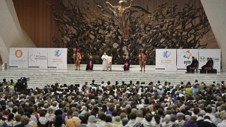 A VI. Pál teremben zajlott audiencián Ferenc pápa a fiatalok kérdéseire válaszolt. A kínai Matthew atyának megköszönte, hogy az imaapostolság a „Kattints rá és imádkozz!” program keretében milliók számára hozzáférhető és ezáltal egyek lesznek az evangélium és az ima szavában.