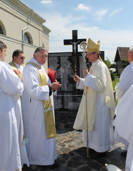 A szentmise végén Bíró Norbert plébános virággal köszöntötte a még élő és az emlékezésen jelen levő három, deportálást megélt falubelit, majd a templom elé vonultak, ahol Schönberger Jenő püspök megáldotta a neveket is tartalmazó emlékművet. Ezt a falubeliek később megkoszorúzták, hosszan elidőztek előtte.